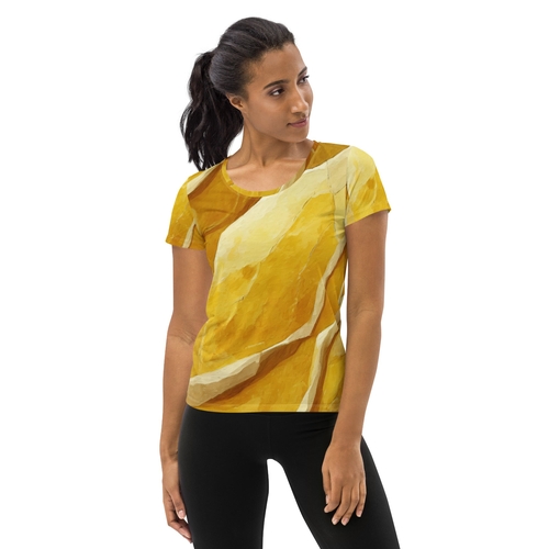 In summary, our Women's Stretch Fit Athletic Sports T-shirt in rustic yellow stone print is the ultimate choice for those who value both performance and style. With its moisture-wicking technology, comfortable fit, and durable construction, this t-shirt is designed to keep up with your active lifestyle. Elevate your workout wardrobe today with this versatile and stylish athletic t-shirt!