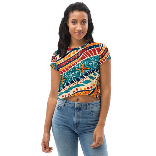 Introducing our Women's Stretch Fit Crop Tee T-shirt, a stylish and comfortable addition to your wardrobe. This chic top features a stunning Boho floral print that adds a touch of vibrancy to any outfit. Made from a blend of 95% polyester and 5% elastane, this crop tee is designed to provide a soft and breathable feel, making it perfect for various occasions, whether you're heading to the gym, running errands, or simply lounging at home.