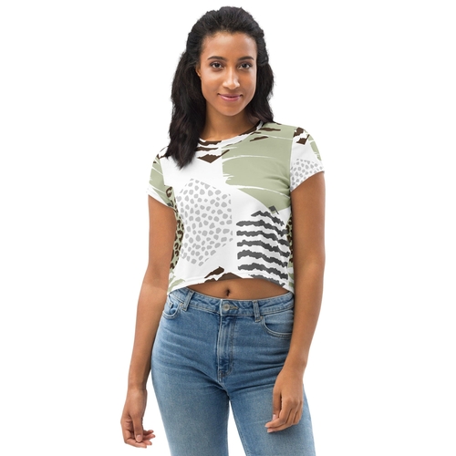 Introducing our Women's Stretch Fit Crop Tee T-shirt, a perfect blend of style and comfort designed for the modern woman. This trendy top features a unique brown and green geometric pattern that adds a touch of flair to your casual wardrobe. Made from a high-quality fabric blend, this crop tee is not only fashionable but also functional, making it an essential piece for any occasion.
