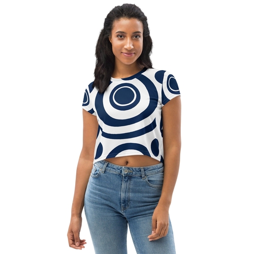 In summary, the Womens Stretch Fit Crop Tee T-shirt in Navy Blue and White Circular pattern is a must-have for any fashion-forward woman. Its combination of comfort, style, and quality makes it an essential addition to your wardrobe. Don't miss out on the opportunity to enhance your casual wear collection with this versatile crop tee!