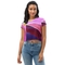 Women's Stretch Fit Crop Tee in pink and purple pattern, showcasing its stylish cropped design and soft fabric.