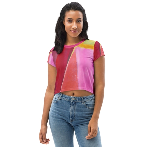 Women's Stretch Fit Crop Tee in Pink Mauve Red Geometric Pattern, showcasing its stylish design and comfortable fit.