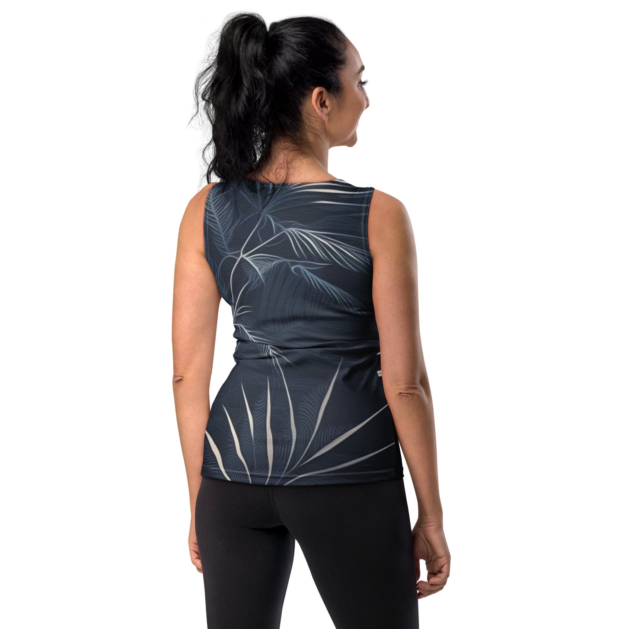 Womens Stretch Fit Tank Top featuring a blue and white palm leaves design, showcasing its sleeveless style and scoop neckline.