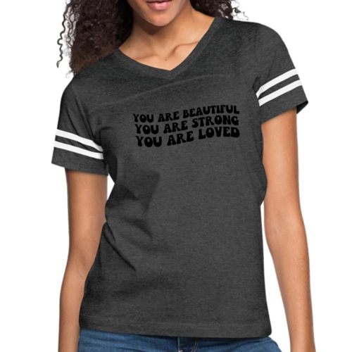 Introducing our Womens Vintage Sport Graphic T-shirt, a perfect blend of style, comfort, and empowerment. This unique tee features the inspiring message 'You Are Beautiful Strong Black,' making it not just a piece of clothing, but a statement of individuality and strength. Crafted from a soft and stretchy cotton blend, this shirt is designed to keep you comfortable whether you're hitting the gym, running errands, or simply lounging at home.