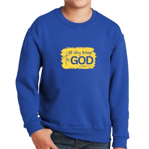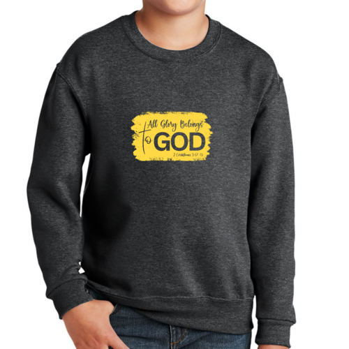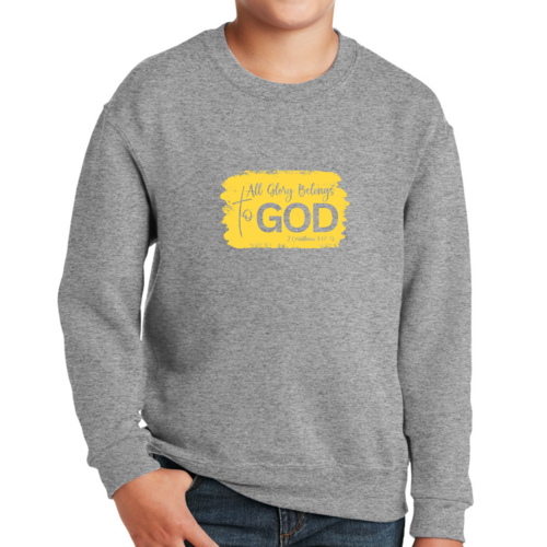 Introducing the Youth Graphic Sweatshirt, a perfect blend of comfort and style for young believers. This sweatshirt features the inspiring message 'All Glory Belongs to God' in a vibrant yellow graphic, making it a standout piece in any wardrobe. Crafted from a durable 50/50 cotton and polyester blend, this sweatshirt is designed to withstand the test of time while providing all-day comfort.
