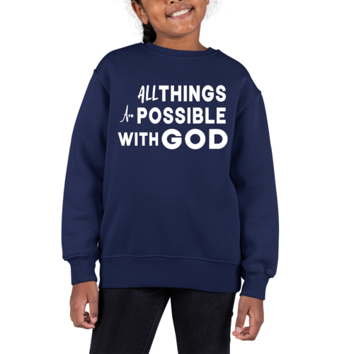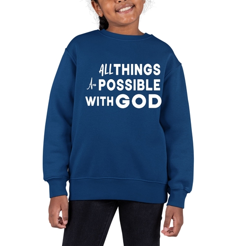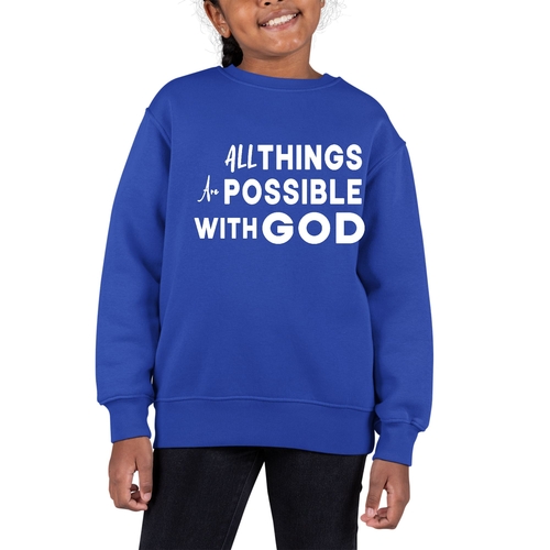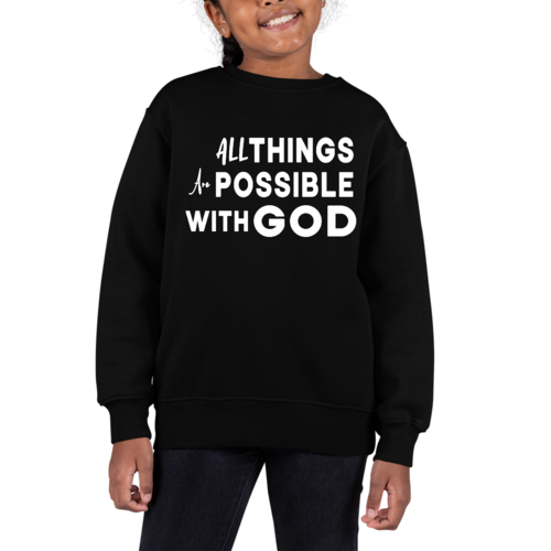 Introducing our Youth Graphic Sweatshirt featuring the inspiring message, 'All Things are Possible with God.' This sweatshirt is designed specifically for girls who want to express their faith while enjoying comfort and style. Made from a durable 50/50 cotton and polyester blend, this sweatshirt is perfect for everyday wear, whether at school, at home, or during outdoor activities.