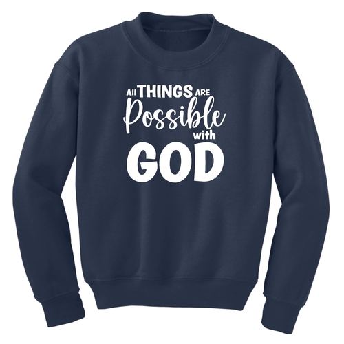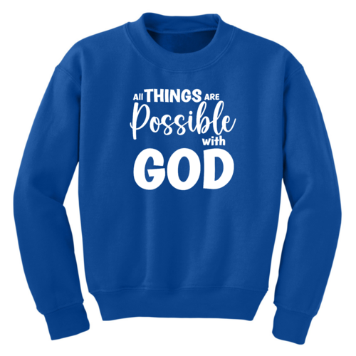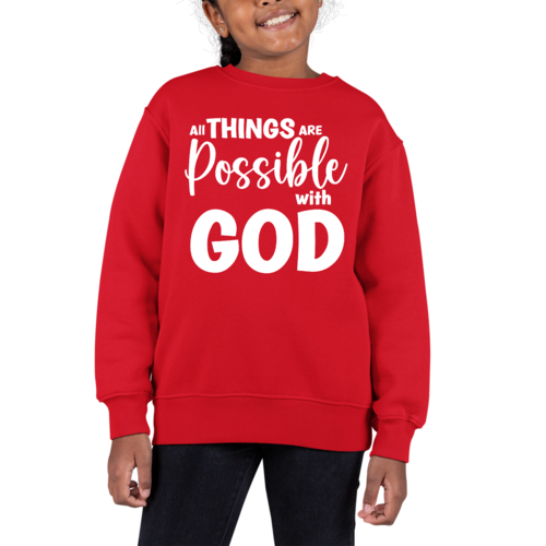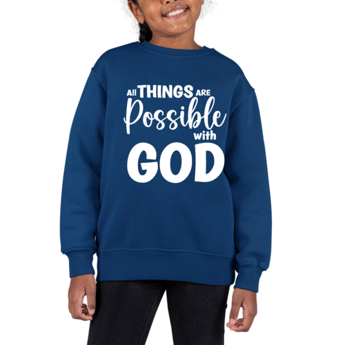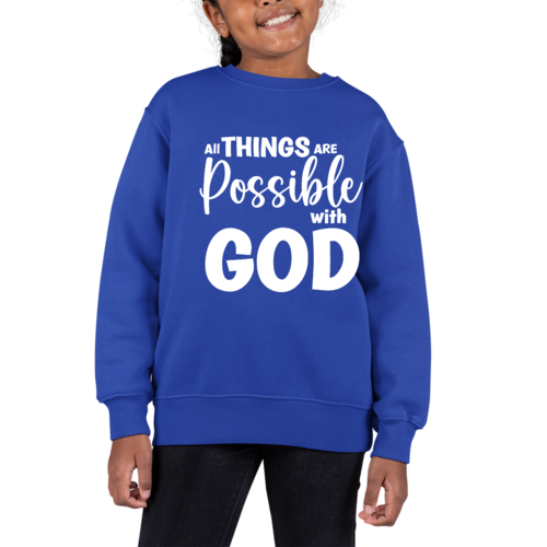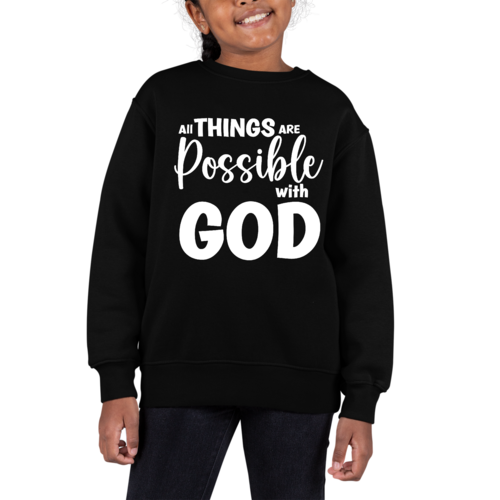 Whether your child is attending a casual gathering, going to school, or simply lounging at home, this sweatshirt is the perfect choice. The uplifting message, 'All Things Are Possible With God,' serves as a daily reminder of faith and positivity, making it not just a piece of clothing, but a source of inspiration.