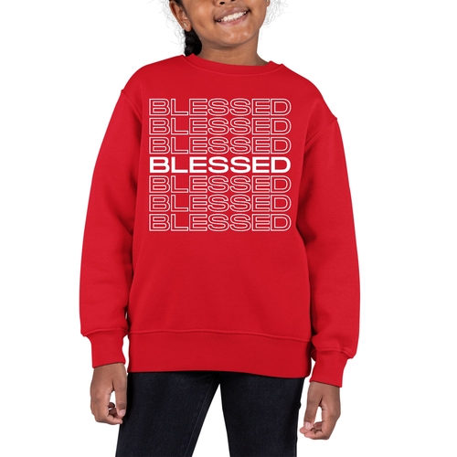 Introducing the Youth Graphic Sweatshirt Blessed Stacked Print, a stylish and comfortable addition to any young girl's wardrobe. This sweatshirt features a unique stacked illustration of the word 'Blessed', making it a perfect choice for those who want to express positivity and style. Crafted from a durable 50/50 cotton and polyester blend, this sweatshirt is designed to withstand the rigors of daily wear while providing ultimate comfort.