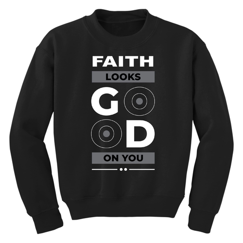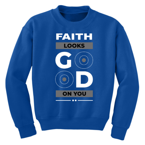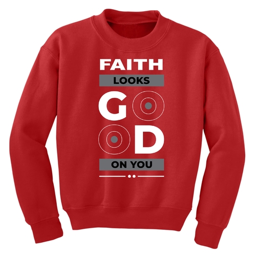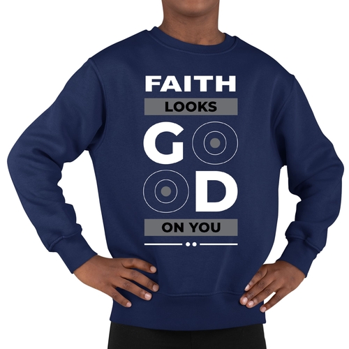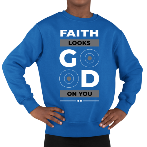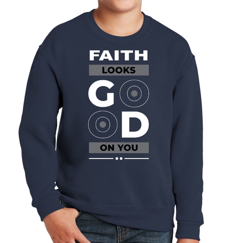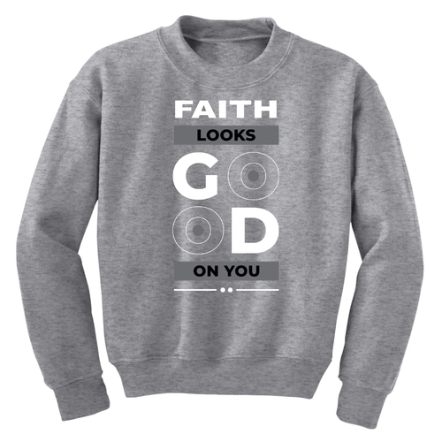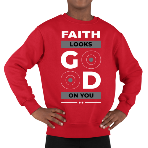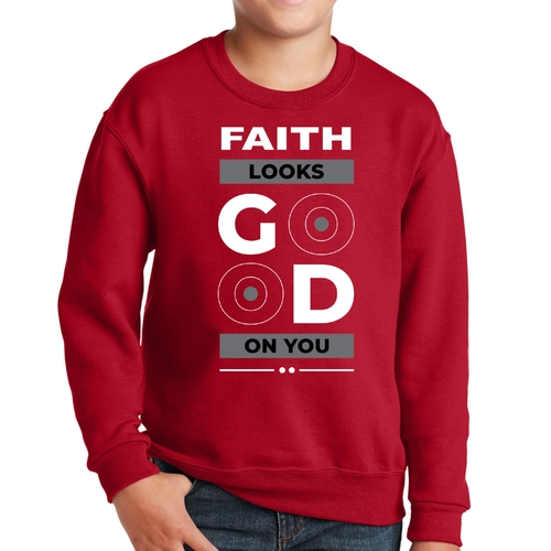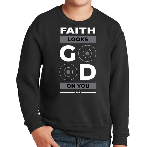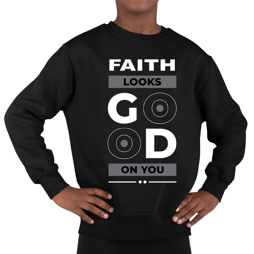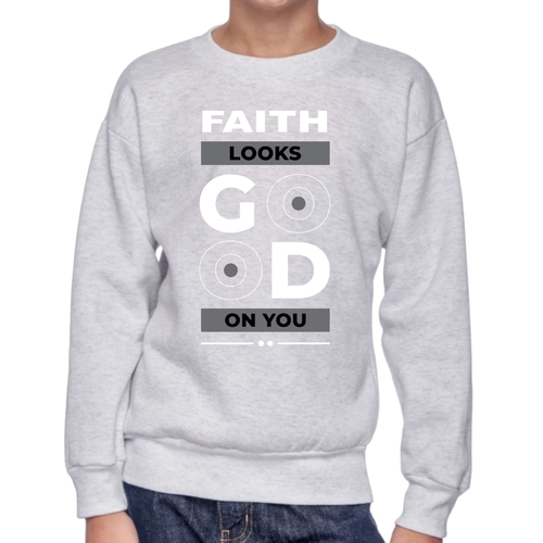 The graphic design on the front of the sweatshirt adds a trendy touch, making it a fashionable choice for young boys. The phrase 'Faith Looks Good' not only makes a statement but also encourages positivity and self-expression. This sweatshirt can easily be paired with jeans, shorts, or joggers, making it a versatile piece for any outfit.