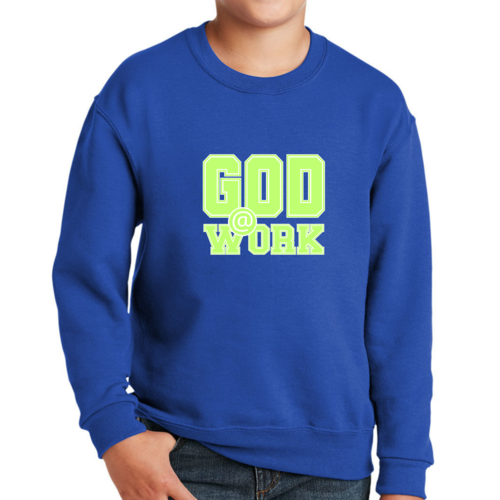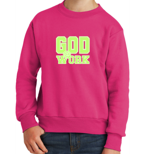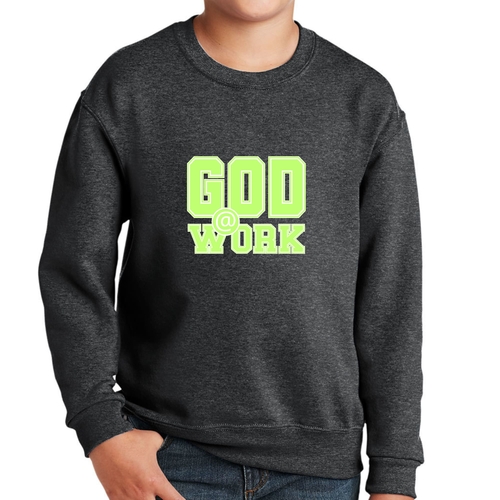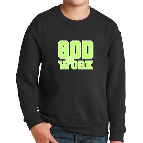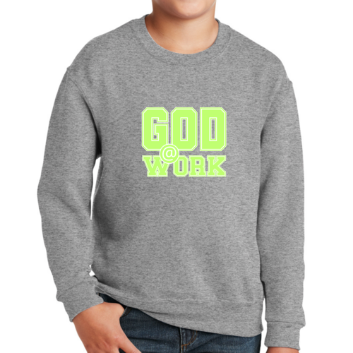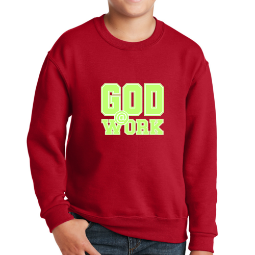 Introducing the Youth Graphic Sweatshirt featuring a striking God @ Work neon green and white print. This stylish crewneck sweatshirt is designed for comfort and durability, making it an ideal choice for active youth. Whether for school, play, or casual outings, this sweatshirt is perfect for expressing faith and individuality.