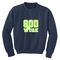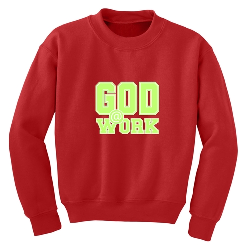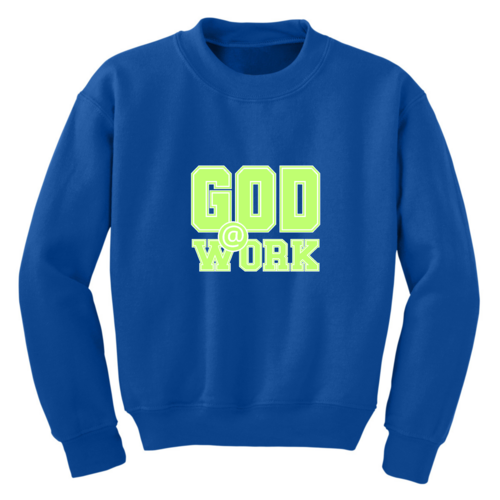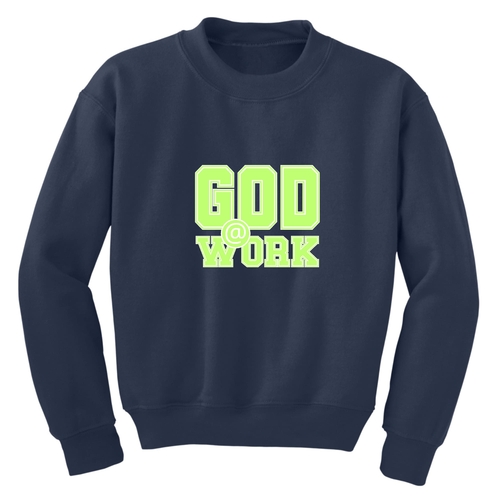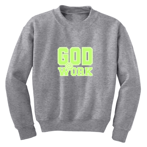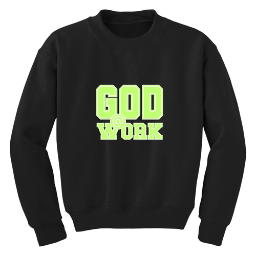 The eye-catching God @ Work print in neon green and white adds a trendy touch to this classic crewneck design. This vibrant graphic is perfect for youth who want to showcase their beliefs in a fashionable way. The long sleeves and ribbed collar, cuffs, and waistband ensure a snug fit, making it suitable for various activities.