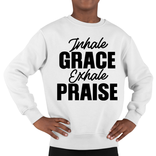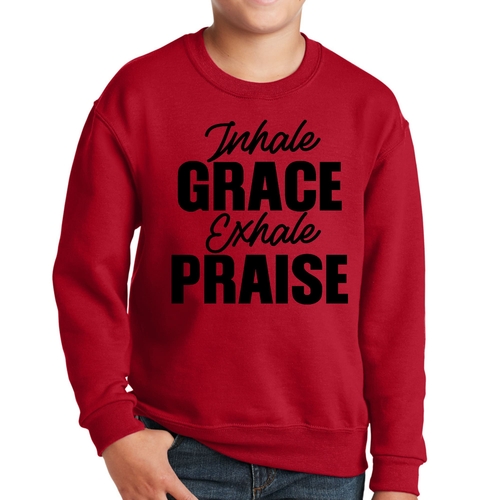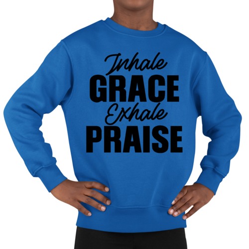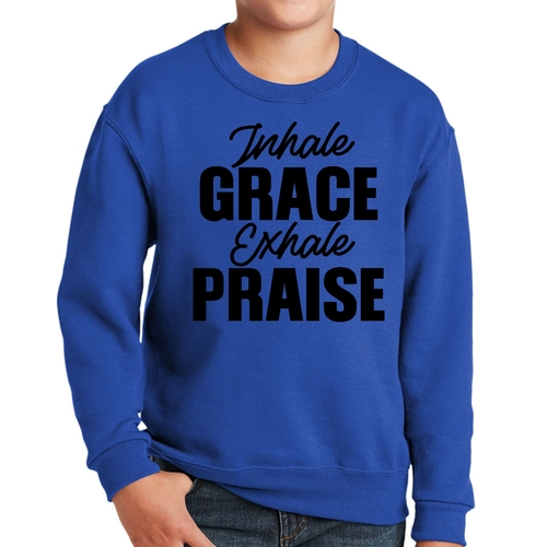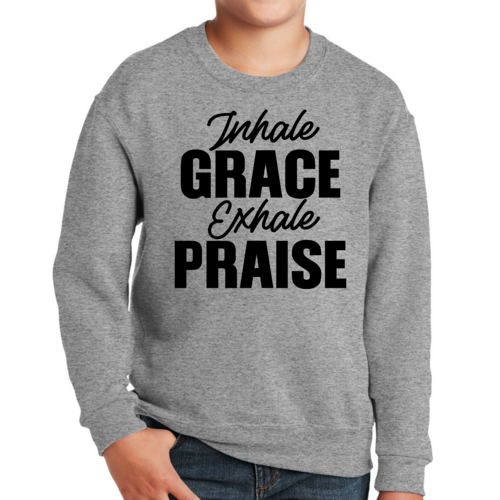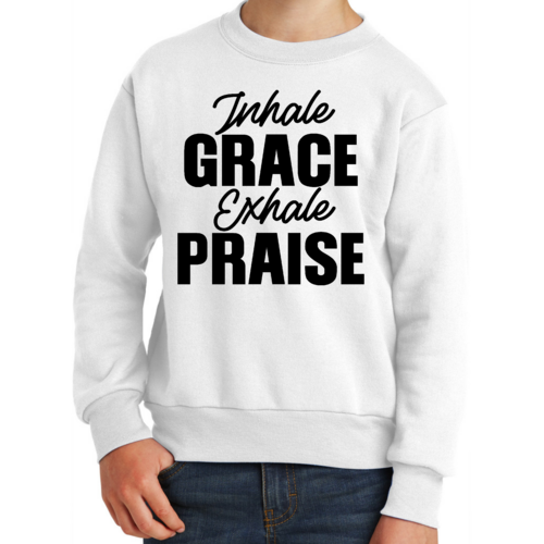 In summary, the Youth Graphic Sweatshirt featuring 'Inhale Grace Exhale Praise' is a must-have for any young boy's wardrobe. With its durable construction, comfortable fit, and easy care, it’s designed to keep up with the active lifestyle of kids while also promoting a positive message. Don’t miss out on this stylish and functional sweatshirt that your child will love!