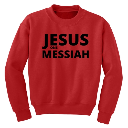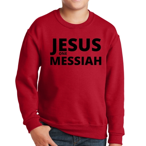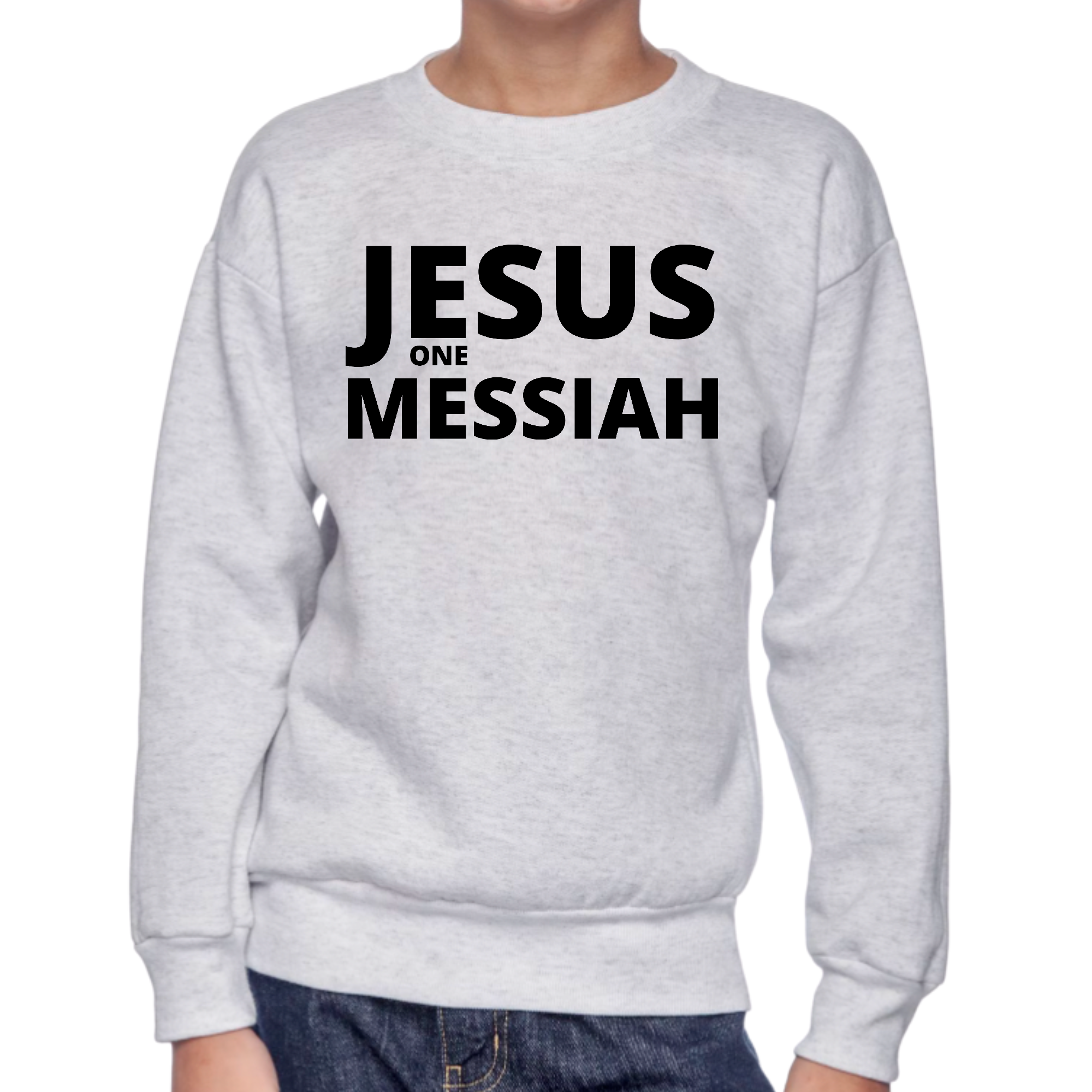 Youth Graphic Sweatshirt with Jesus one Messiah black illustration, featuring long sleeves and ribbed collar.