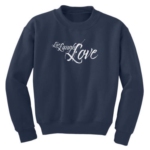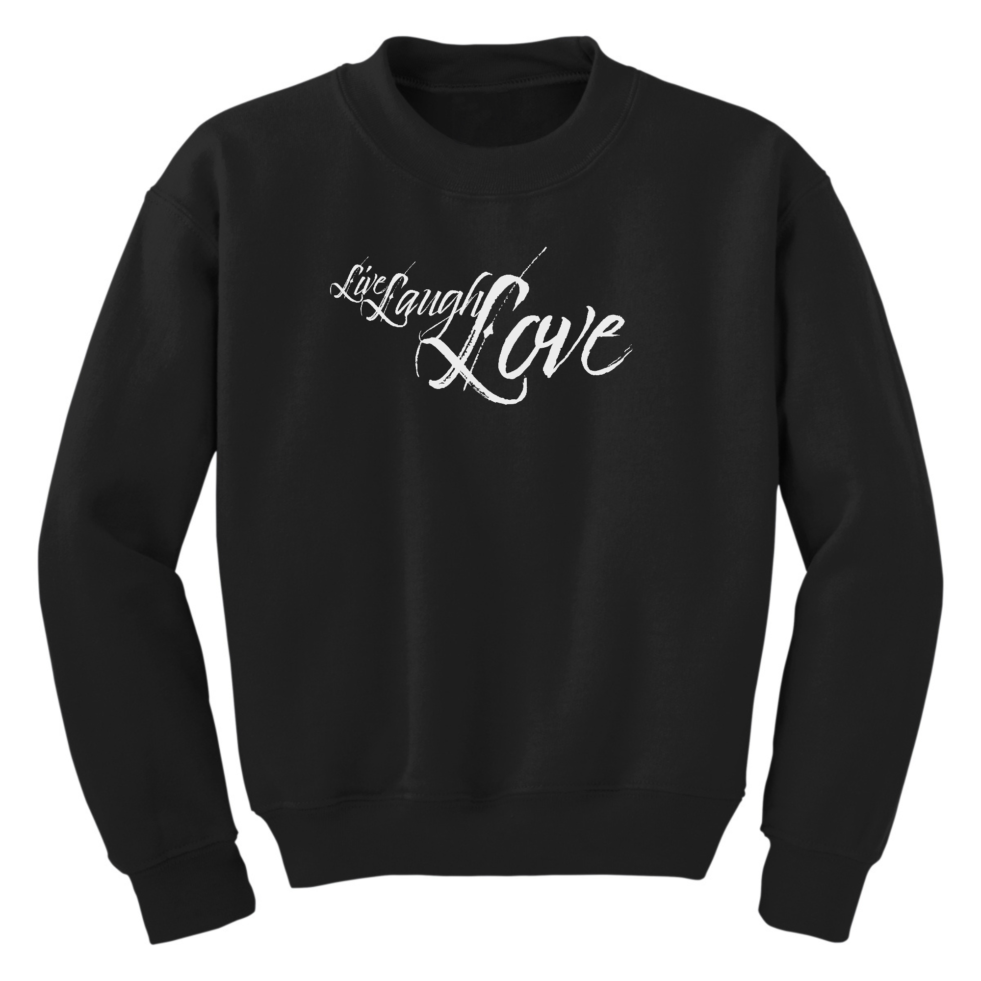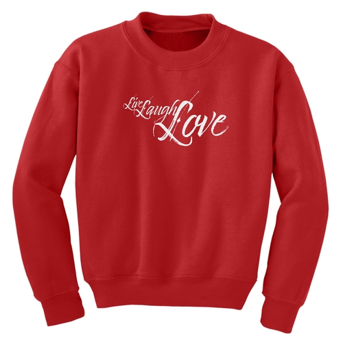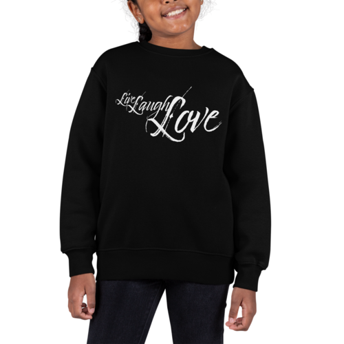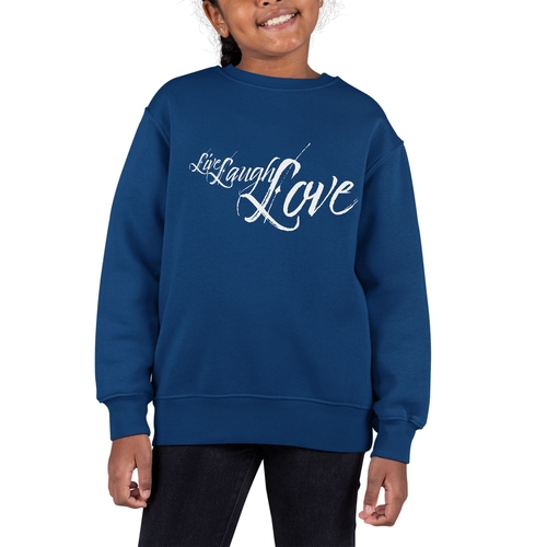 Introducing the Youth Graphic Sweatshirt featuring the uplifting phrase 'Live Laugh Love' in a stylish light grey color. This sweatshirt is designed specifically for girls who want to express their personality while enjoying comfort and durability. Made from a high-quality 50/50 cotton and polyester blend, this sweatshirt is perfect for everyday wear, whether at school, hanging out with friends, or lounging at home.