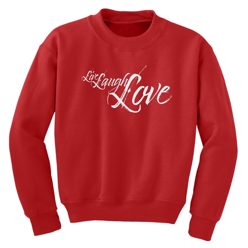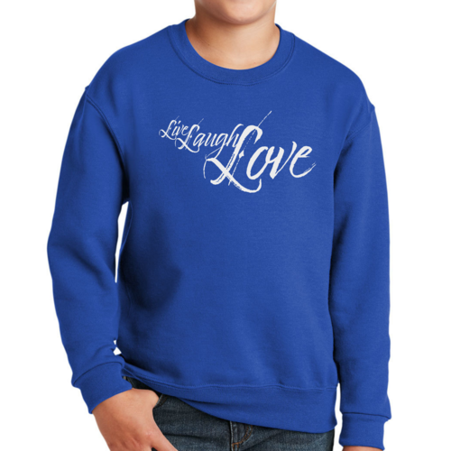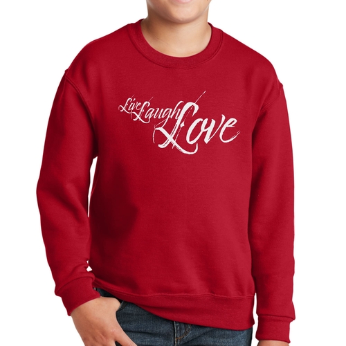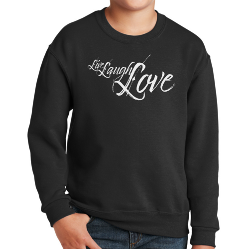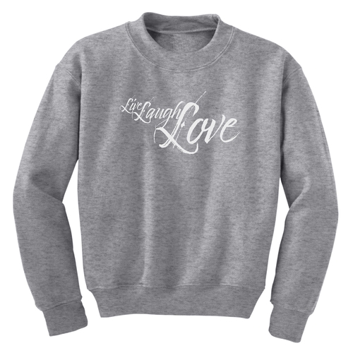 Introducing the Youth Graphic Sweatshirt featuring the uplifting phrase 'Live Laugh Love' in a stylish light grey color. This sweatshirt is designed for comfort and durability, making it an ideal choice for active youth. Whether for school, playdates, or lounging at home, this sweatshirt provides the perfect blend of style and functionality.