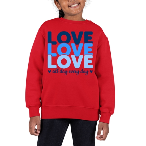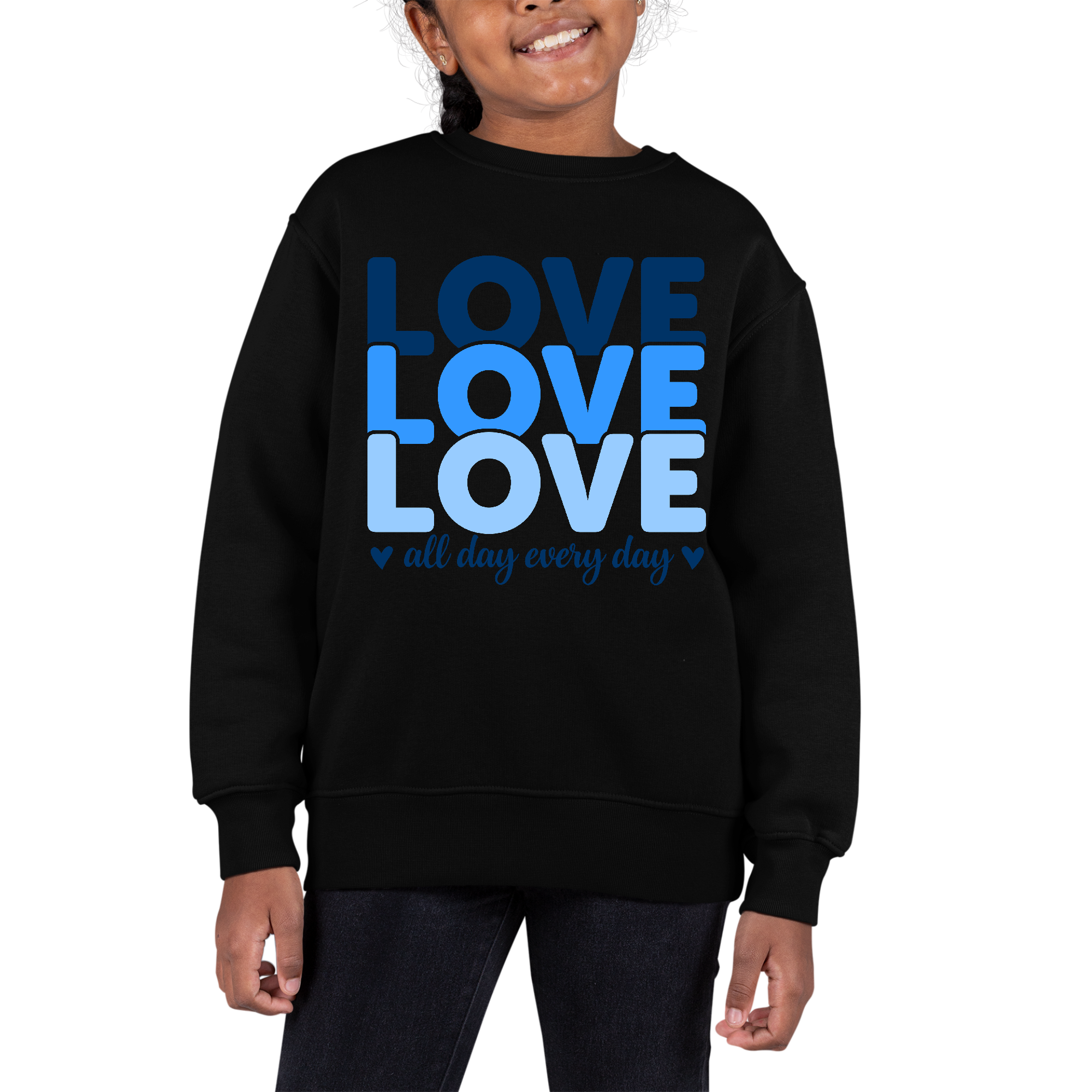 In summary, the Youth Graphic Sweatshirt featuring the Love All Day Every Day Blue Print is a must-have for any young fashionista. Its combination of comfort, durability, and style makes it an essential addition to their wardrobe. Shop now to give your child a sweatshirt they will love to wear every day!