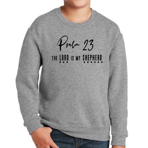 Youth graphic sweatshirt in black featuring Psalm 23, 'The Lord is my Shepherd', with a comfortable crewneck design.