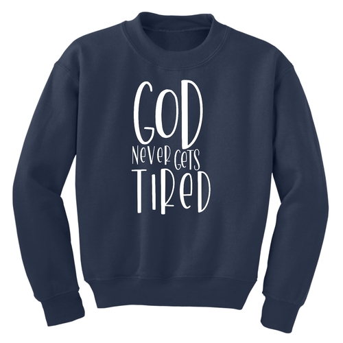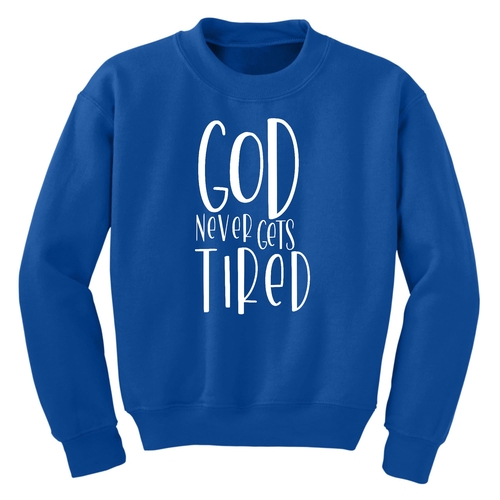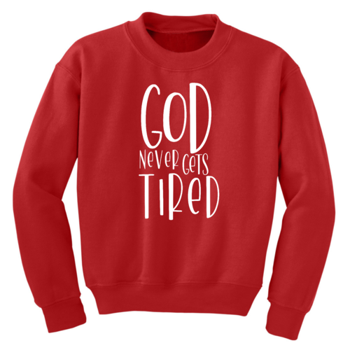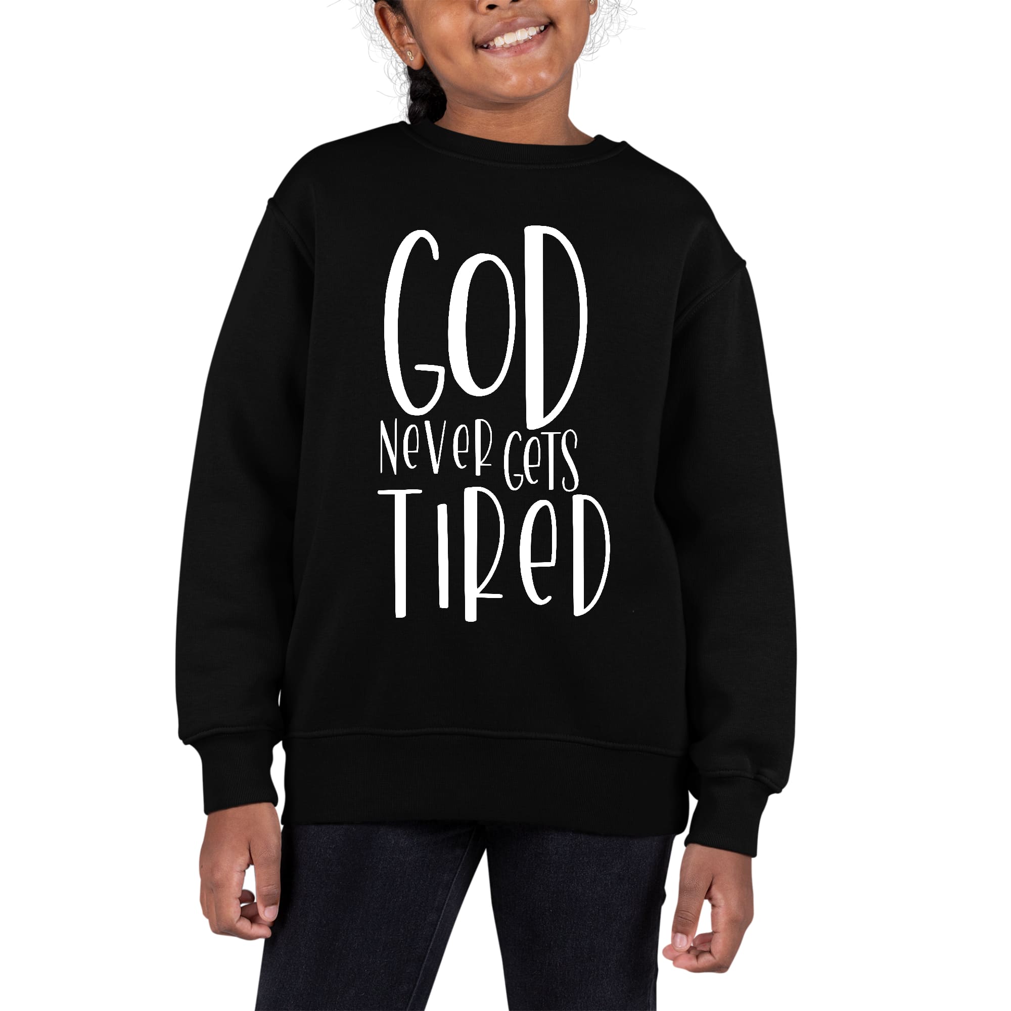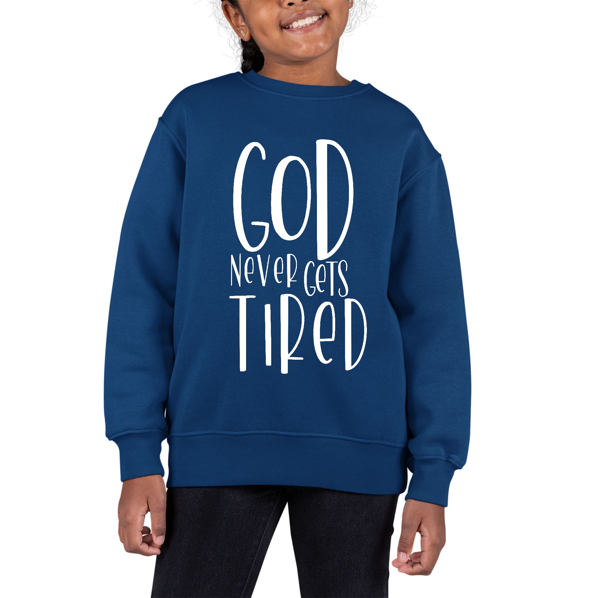 One of the standout features of the 'God Never Gets Tired' sweatshirt is its pill-resistant material. This means that it will maintain its fresh look even after multiple washes, making it a smart investment for any young wardrobe. Parents will appreciate the quality craftsmanship, including double-stitched reinforced seams that add to the longevity of the garment.
