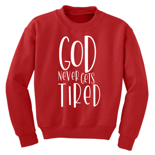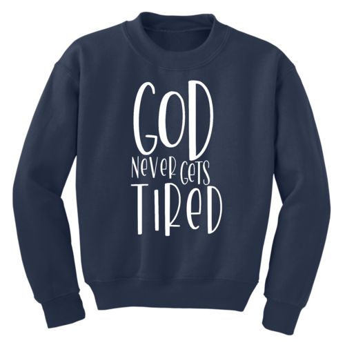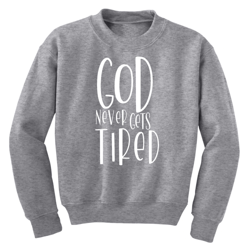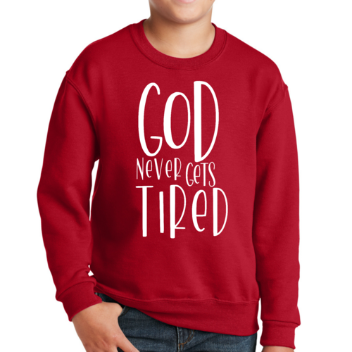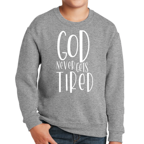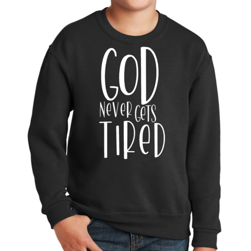 The Say It Soul - God Never Gets Tired Youth Graphic Sweatshirt is the perfect blend of style, comfort, and durability. Designed for young individuals who appreciate both fashion and functionality, this sweatshirt features a unique graphic that resonates with positivity and faith. Made from a high-quality 50/50 cotton and polyester blend, it ensures a soft touch against the skin while providing the durability needed for everyday wear.