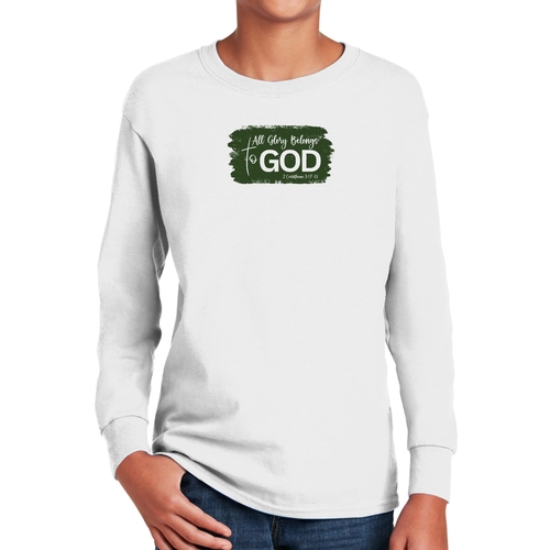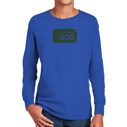 The Youth Long Sleeve Graphic T-shirt, featuring the inspiring phrase 'All Glory Belongs to God', is a must-have addition to any young person's wardrobe. Made from soft, preshrunk cotton, this dark green t-shirt is not only stylish but also incredibly comfortable, making it perfect for any season. Whether your child is looking for a cozy shirt for winter, a lightweight option for spring, or a fashionable piece for fall, this long sleeve tee has them covered.