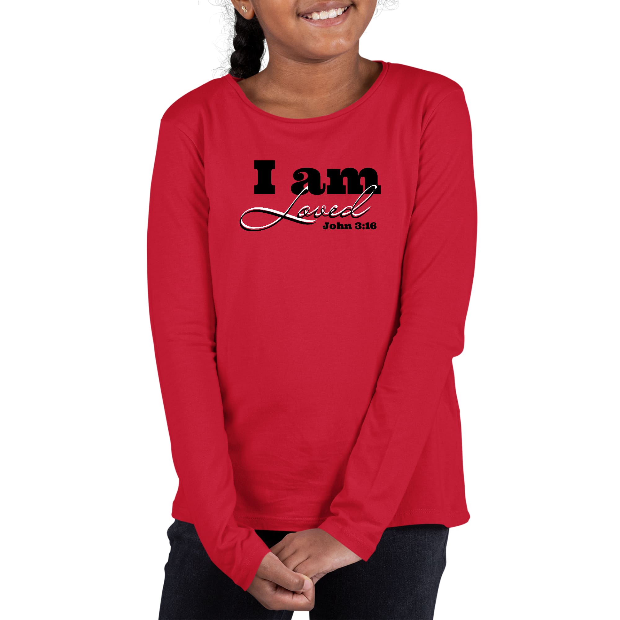 Introducing the Youth Long Sleeve Graphic T-shirt, 'I am Loved' - John 3:16 in black, a perfect blend of style, comfort, and durability. This graphic tee is designed specifically for young girls who want to express their faith and love through fashion. Made from high-quality preshrunk cotton, this shirt ensures that it retains its softness and size even after multiple washes, making it an ideal choice for everyday wear.