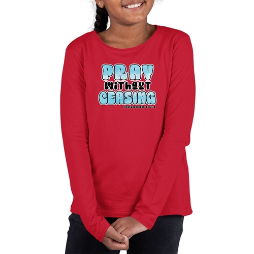 Introducing our Youth Long Sleeve Graphic T-shirt, designed specifically for girls who value both comfort and style. This tee features the inspiring message 'Pray Without Ceasing', making it a perfect choice for young believers. Crafted from high-quality cotton, this shirt is not only soft against the skin but also durable enough to withstand everyday wear and tear.