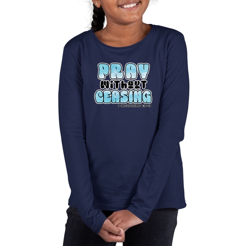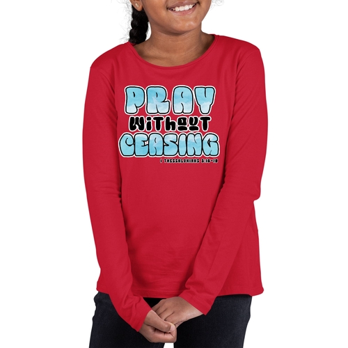 The 'Pray Without Ceasing' graphic adds a touch of inspiration to this classic long sleeve tee. It serves as a reminder of faith and positivity, making it a great choice for school, church, or casual outings. The stylish design is sure to be a hit among young girls who want to express their beliefs through fashion.