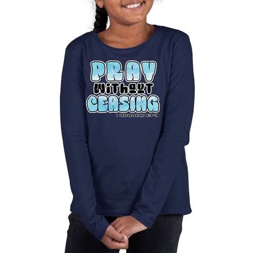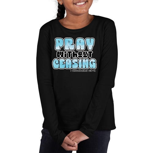 Youth long sleeve graphic T-shirt featuring 'Pray Without Ceasing' design, made from soft cotton material.