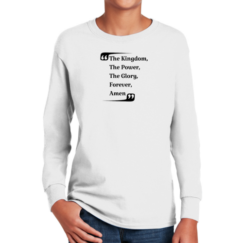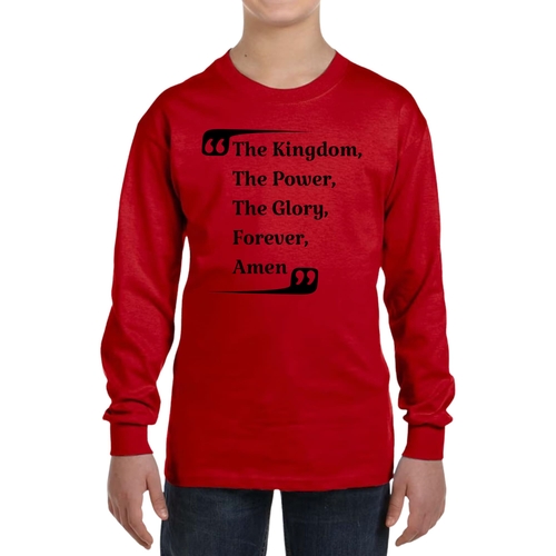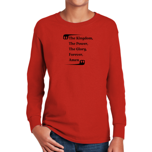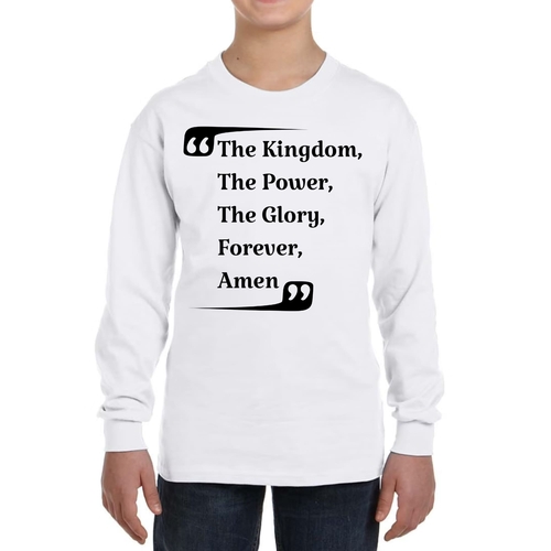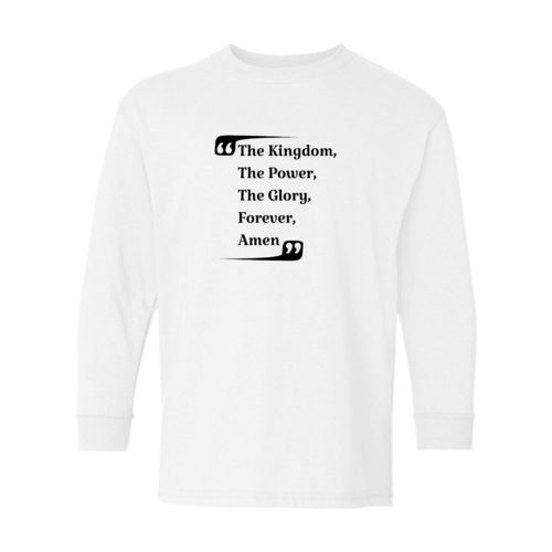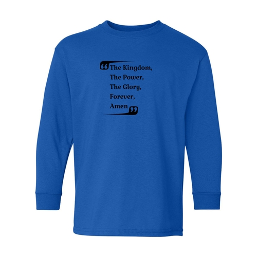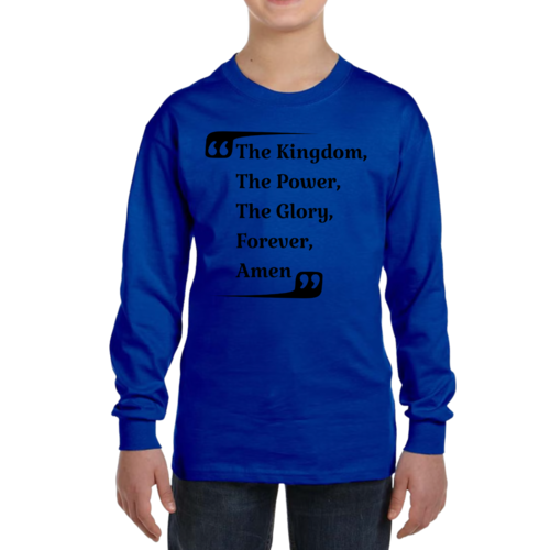 The Youth Long Sleeve Graphic T-shirt, titled 'the Kingdom the Power the Glory', is an essential addition to any boy's wardrobe. This long sleeve tee is designed with comfort and style in mind, making it perfect for everyday wear or special occasions. Crafted from high-quality cotton material, this shirt offers a soft touch against the skin, ensuring that your child stays comfortable throughout the day.
