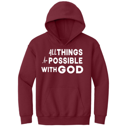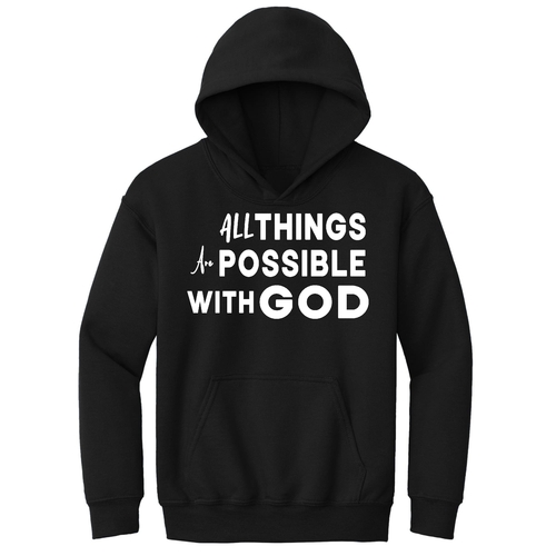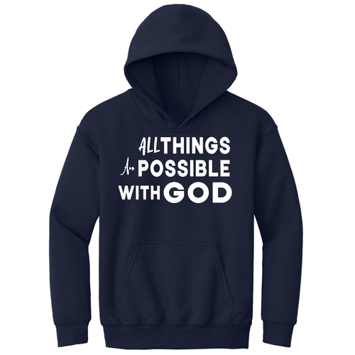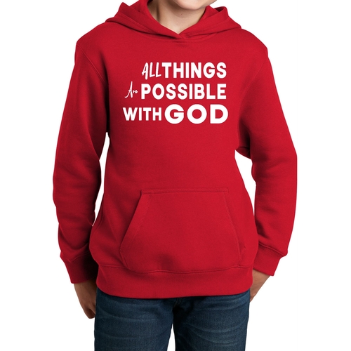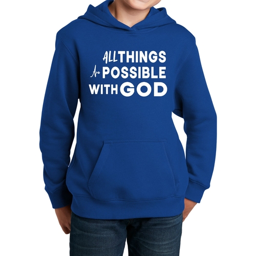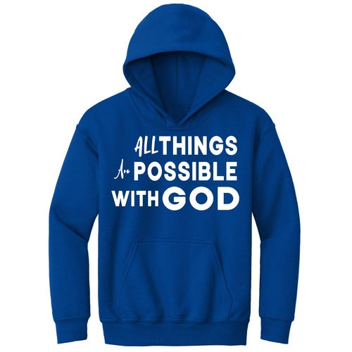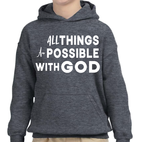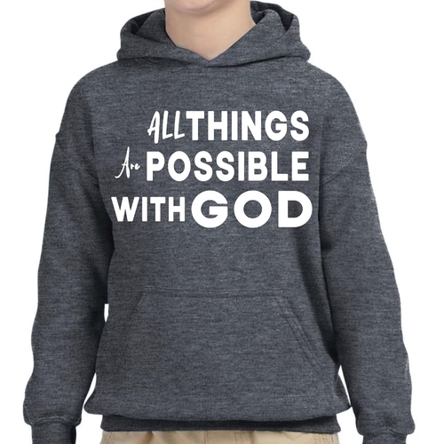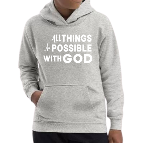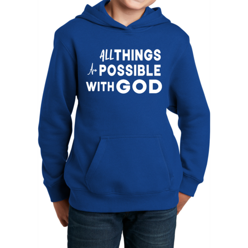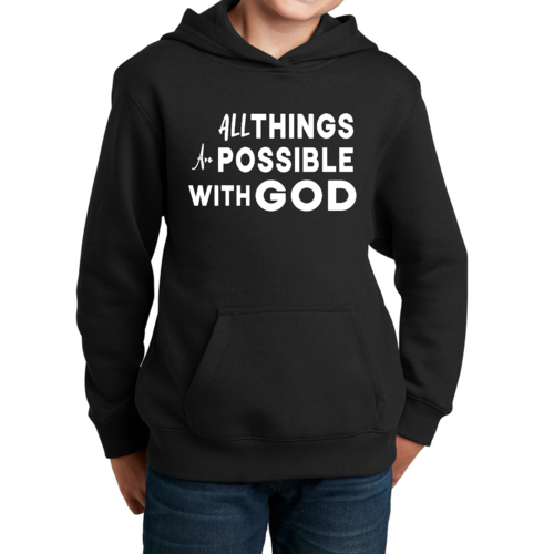 In summary, the Youth Long Sleeve Hoodie with the message 'All Things are Possible with God' is a must-have for boys who appreciate comfort, durability, and style. With its soft fabric, inspiring design, and practical features, this hoodie is sure to become a favorite in any young boy's wardrobe.