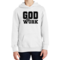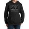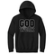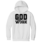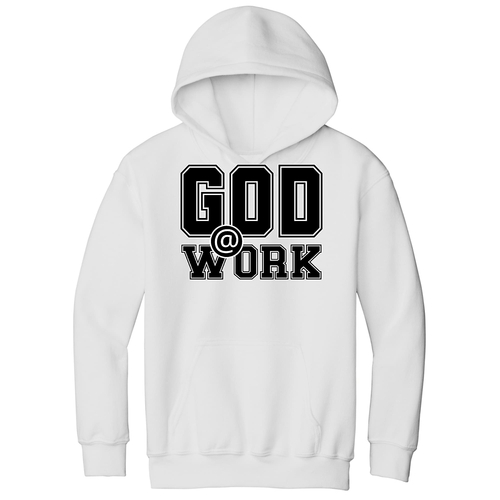 Youth long sleeve hoodie featuring 'God @ Work' print in black and white, showcasing a comfortable and stylish design.