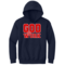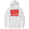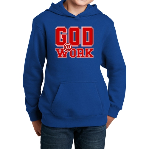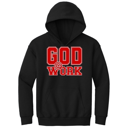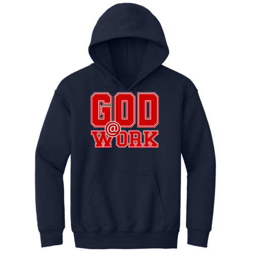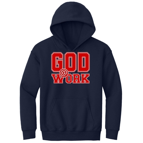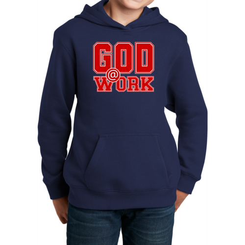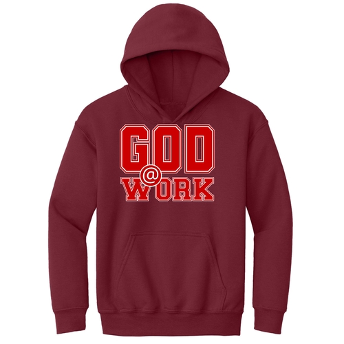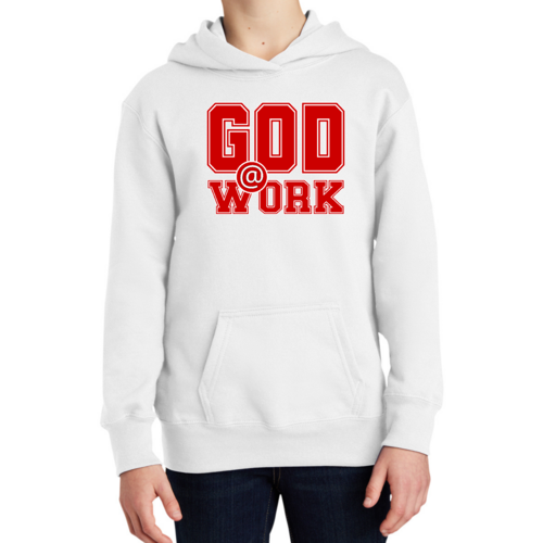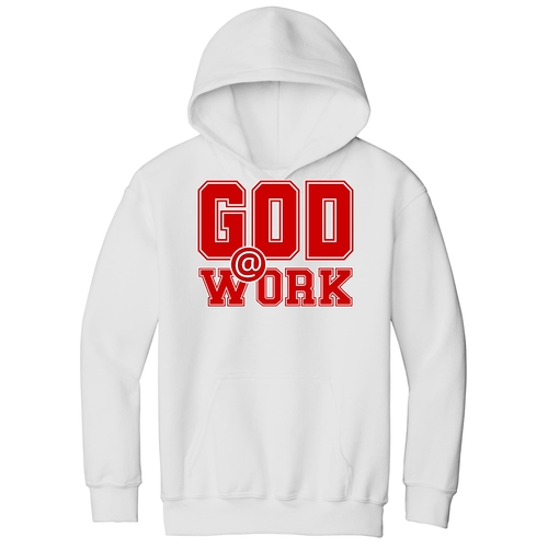 Youth long sleeve hoodie in red and white with 'God @ Work' graphic print, featuring a drawstring neckline and comfortable fit.