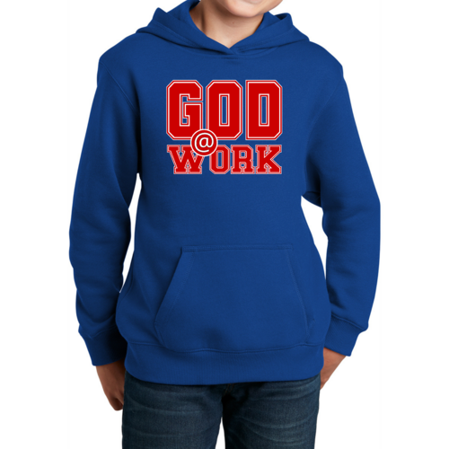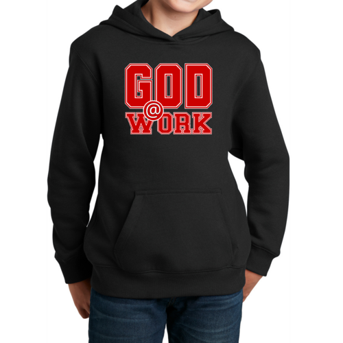 In summary, the Youth Long Sleeve Hoodie with 'God @ Work' red and white print is a must-have for any young person. With its soft fabric, durable construction, and stylish design, it’s perfect for everyday wear. Don’t miss out on the opportunity to add this versatile hoodie to your child’s wardrobe today!