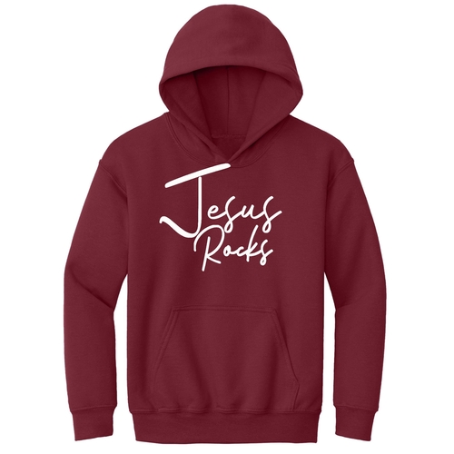 Youth long sleeve hoodie with Jesus Rocks print, featuring a drawstring neckline and durable fabric.