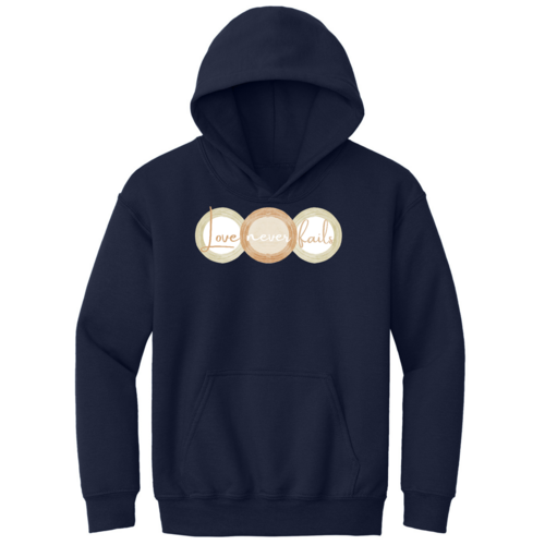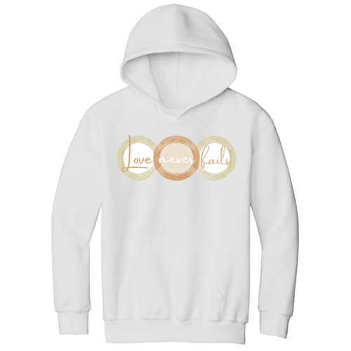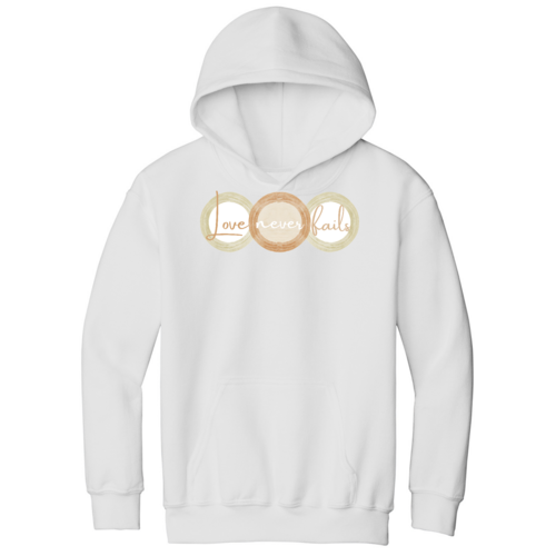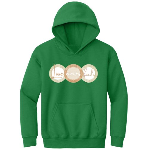 Introducing the Youth Long Sleeve Hoodie 'Love Never Fails' in a beautiful pastel brown, beige, and green color palette. This hoodie is designed for comfort and style, making it a perfect addition to any young person's wardrobe. Crafted from a high-quality 50/50 cotton and polyester blend, it offers a soft touch while ensuring durability for everyday wear.