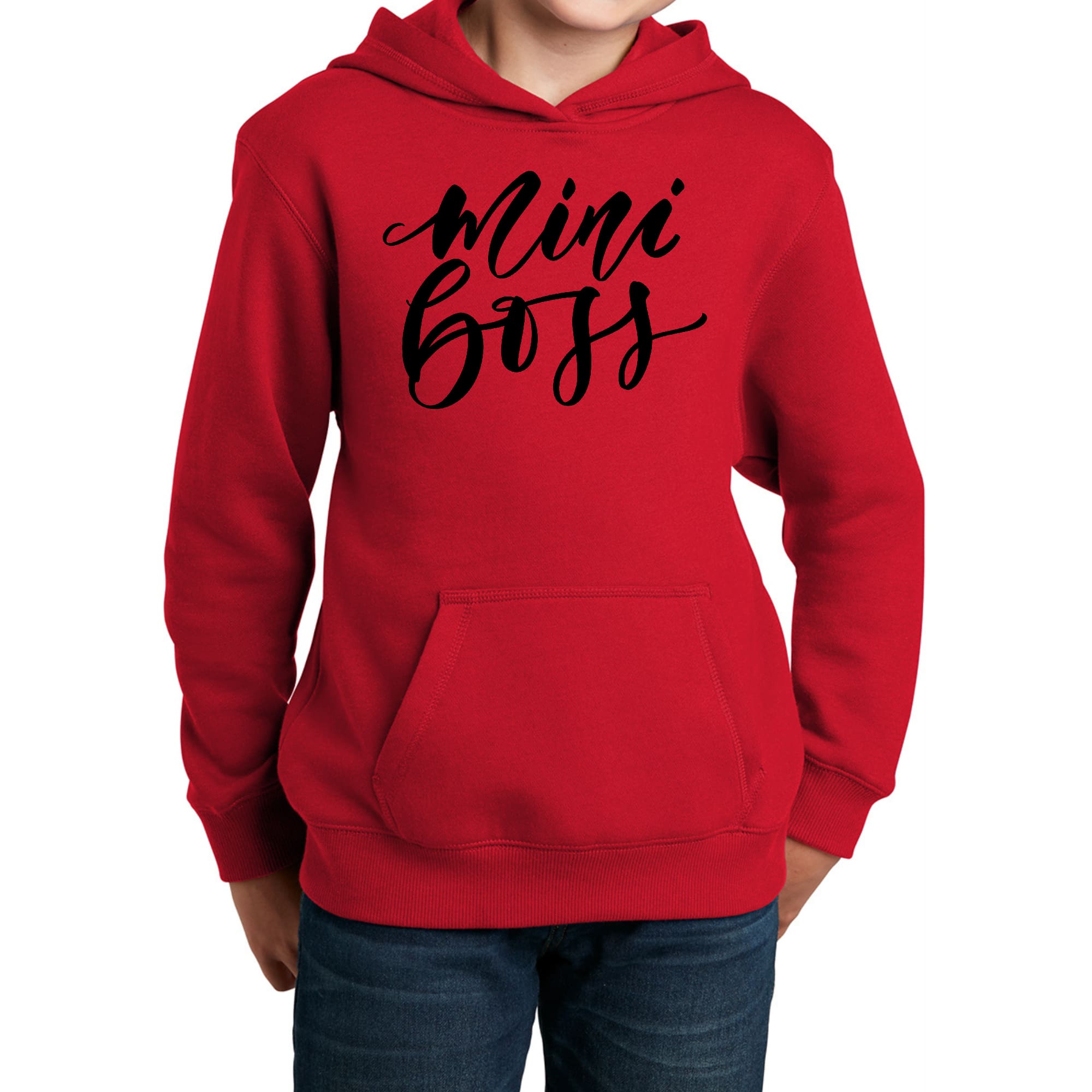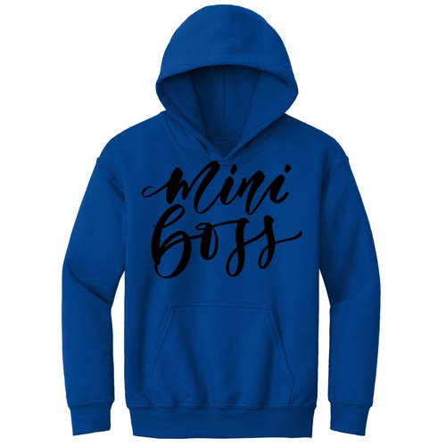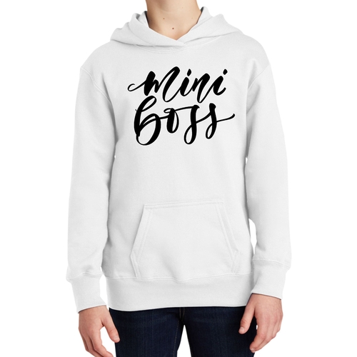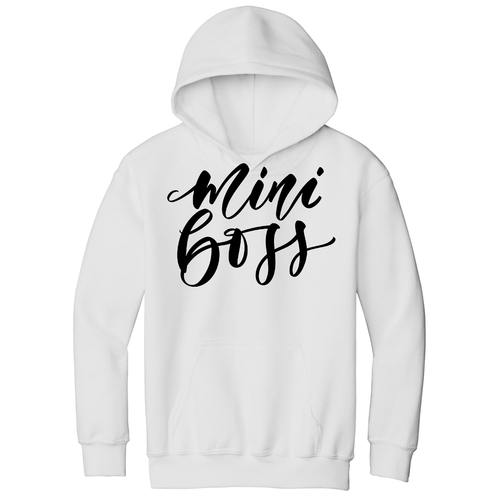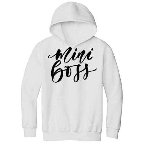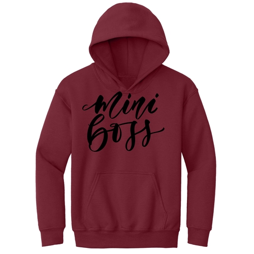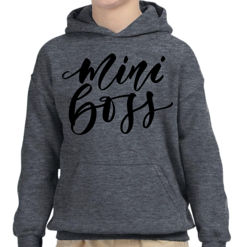 In summary, the Youth Long Sleeve Hoodie Mini Boss with its black illustration is a perfect blend of style, comfort, and durability. It is designed to meet the needs of active boys while providing a fashionable look that they will love. With its easy care instructions and wide range of sizes, this hoodie is a practical choice for any parent looking to enhance their child's wardrobe.