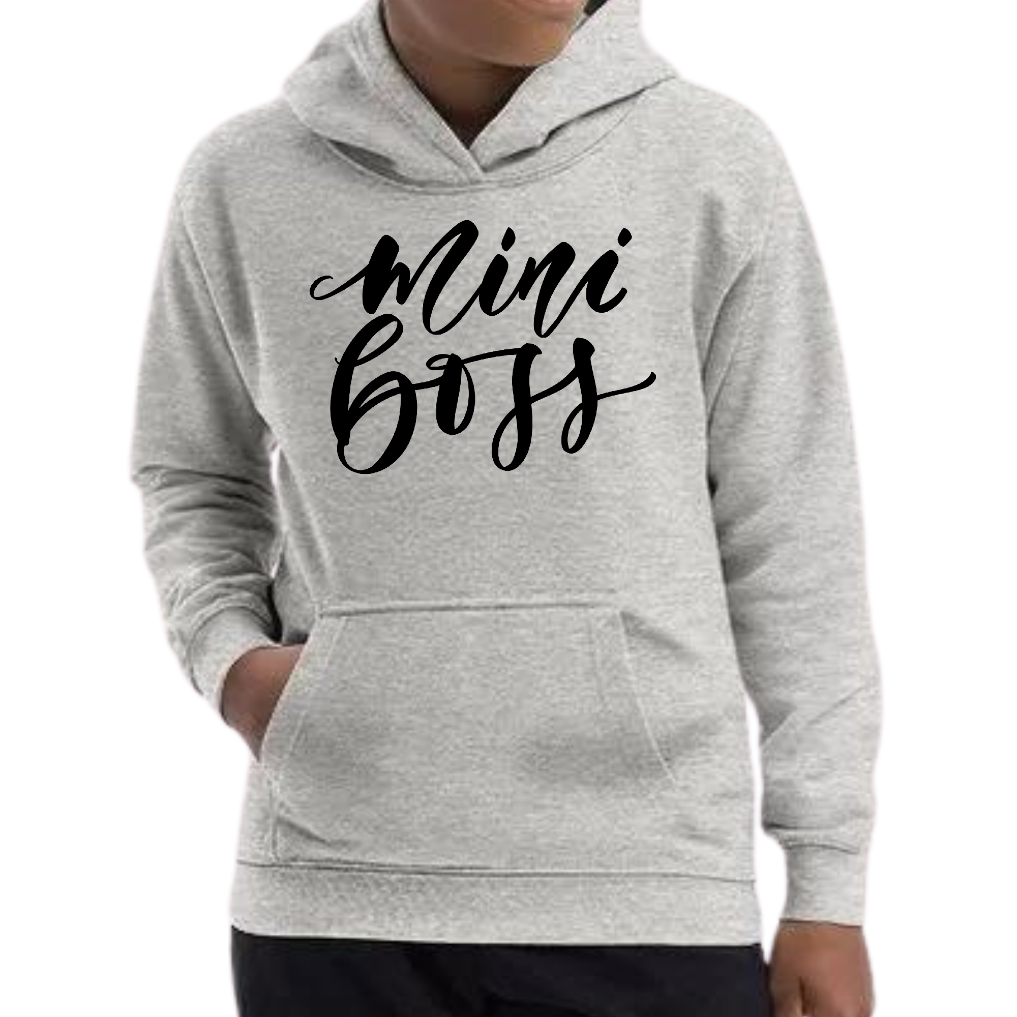 Youth Long Sleeve Hoodie Mini Boss featuring a stylish black illustration, perfect for boys' casual wear.