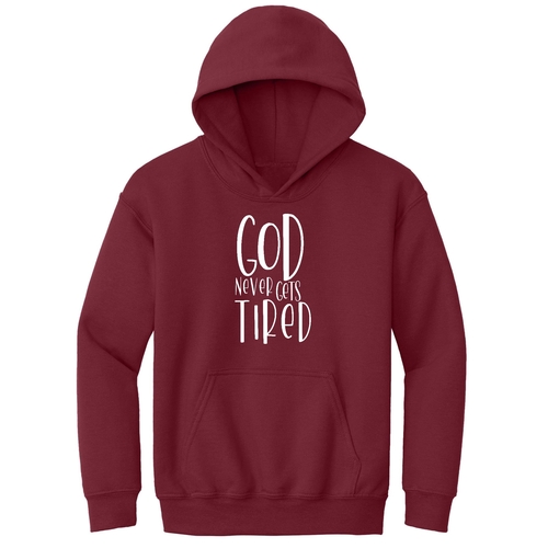 This hoodie features a unique graphic print that boldly states 'God Never Gets Tired', making it not only a fashion statement but also a conversation starter. The design is professionally printed in the USA, ensuring vibrant colors and sharp details that won't fade over time. The drawstring neckline adds a trendy touch while allowing for adjustable comfort, making it suitable for various weather conditions.