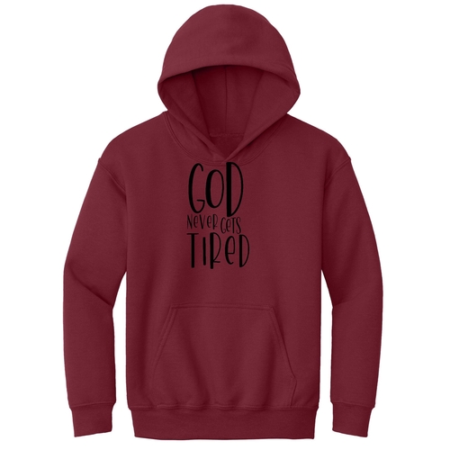 This hoodie is not just a piece of clothing; it's a statement of faith. It can be worn for various occasions, whether it's a casual day at school, a family outing, or a church event. The inspirational quote 'God Never Gets Tired' serves as a conversation starter and a source of encouragement for your child and those around them.