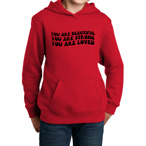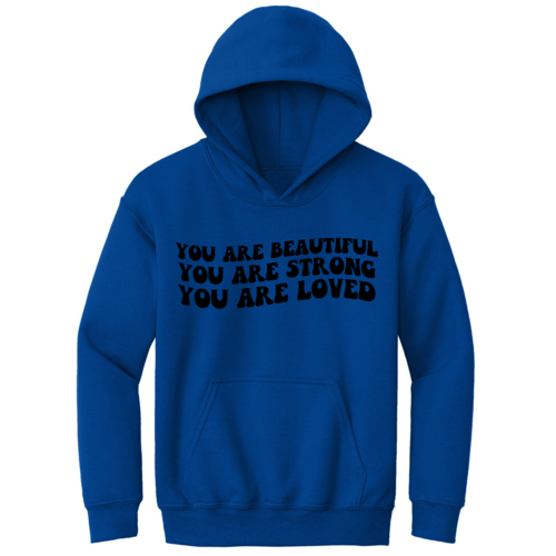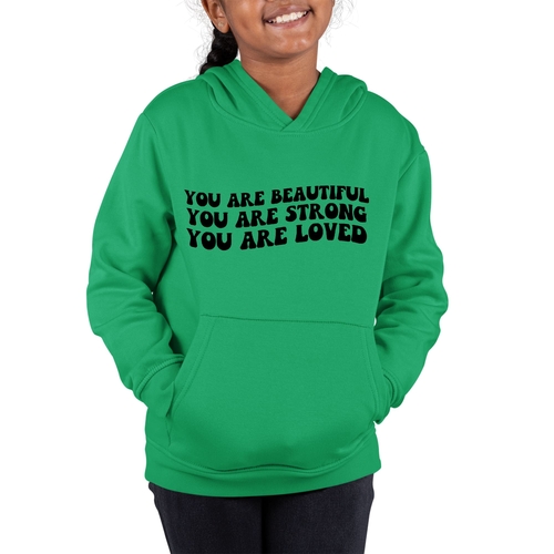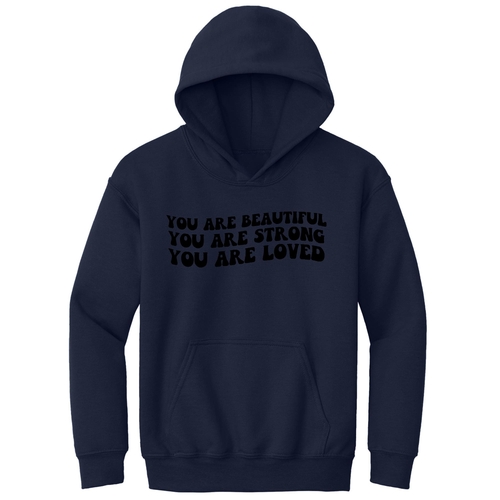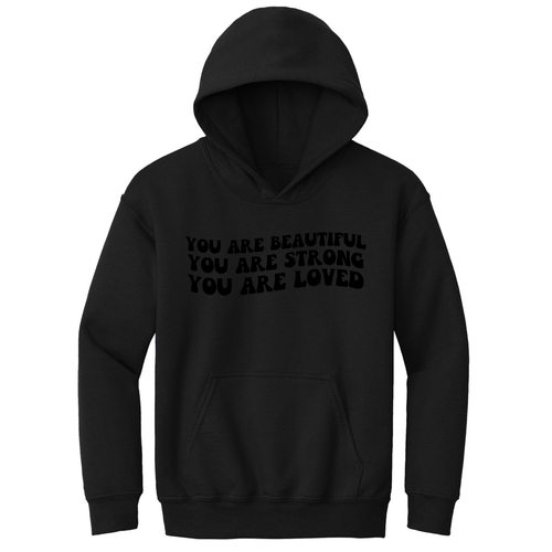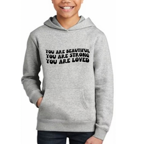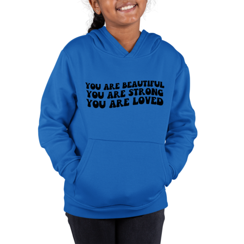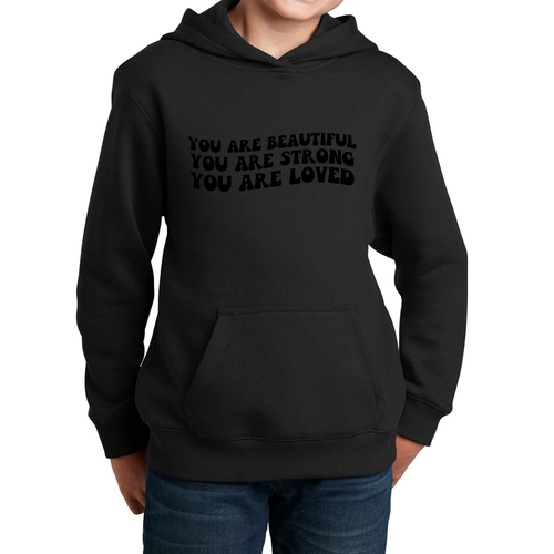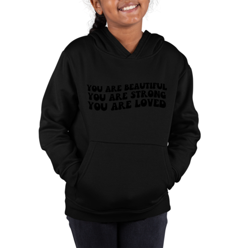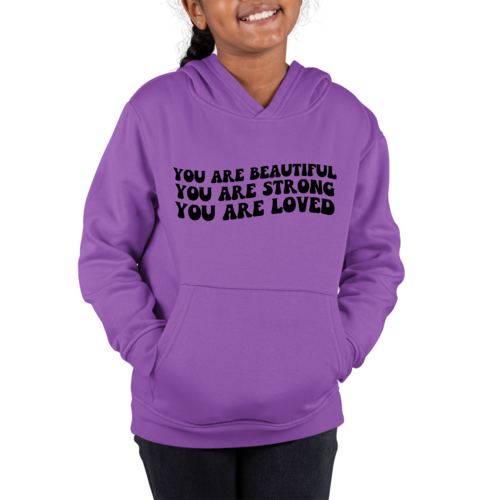 Introducing our Youth Long Sleeve Hoodie, a perfect blend of style, comfort, and inspiration. This hoodie features a beautiful illustration with the empowering affirmation 'You Are Beautiful, Strong, Loved.' Designed specifically for girls, this hoodie not only makes a fashion statement but also serves as a daily reminder of self-worth and strength.