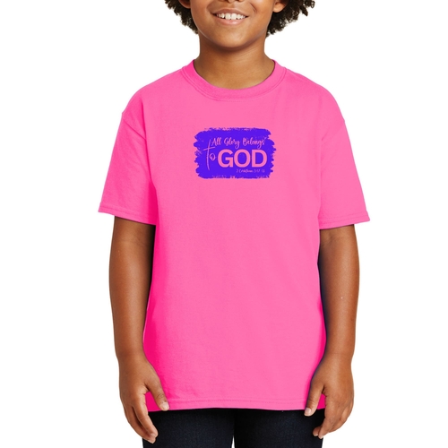 Introducing our Youth Short Sleeve Graphic T-shirt, a perfect blend of comfort and style for young believers. This t-shirt features the inspiring message 'All Glory Belongs to God' in a vibrant purple graphic illustration, making it a wonderful addition to any child's wardrobe. Crafted from soft, preshrunk cotton, this shirt is designed to retain its shape and softness even after multiple washes, ensuring long-lasting wear.