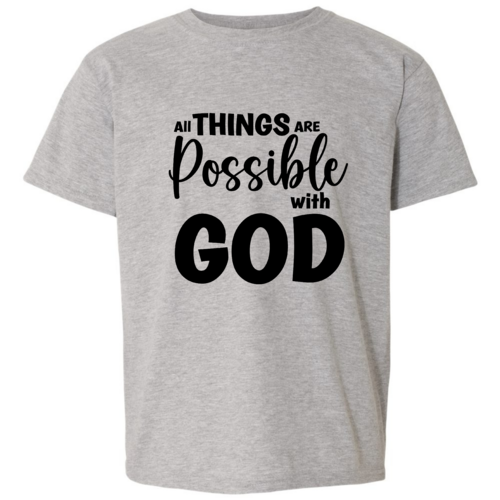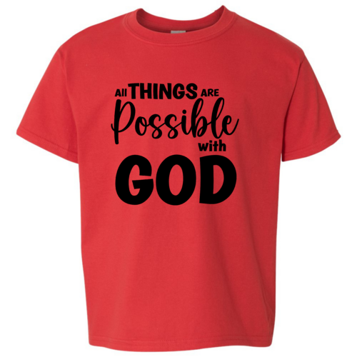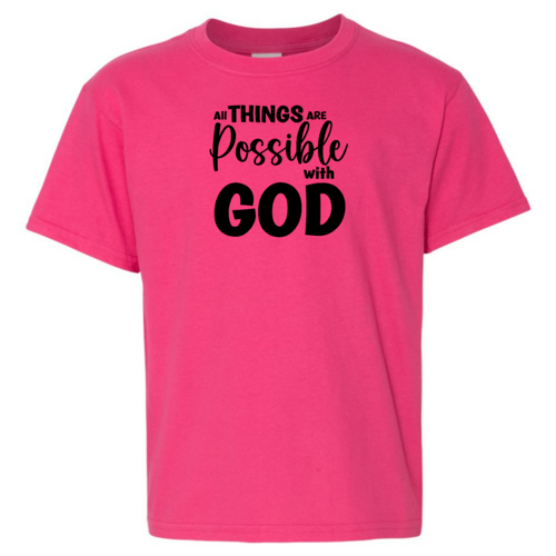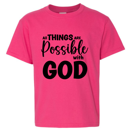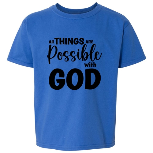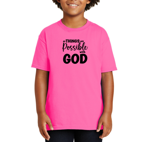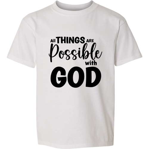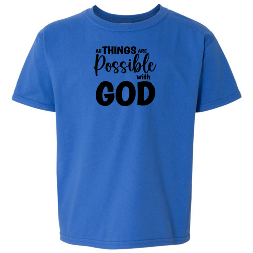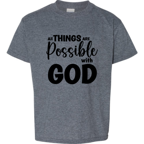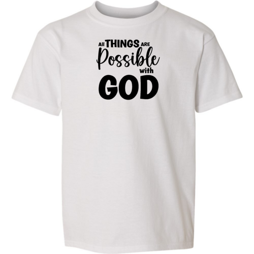 Introducing our Youth Short Sleeve Graphic T-shirt, emblazoned with the inspiring message 'All Things are Possible with God.' This stylish and comfortable tee is perfect for both boys and girls, making it a versatile addition to any young person's wardrobe. Crafted from high-quality preshrunk cotton, this shirt is designed to maintain its softness and size even after multiple washes, ensuring long-lasting wear.