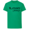 To maintain the quality of the Blessed by Design t-shirt, it is recommended to wash it in cool water. For drying, you can either hang it to dry or tumble dry on low heat. Avoid dry cleaning to preserve the fabric's integrity. Please note that while the preshrunk cotton helps maintain the shirt's size, the content of the fabric may vary slightly for some colors.
