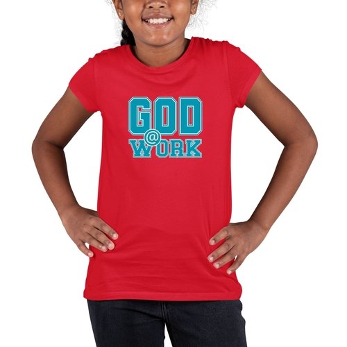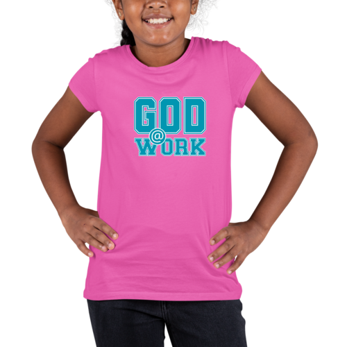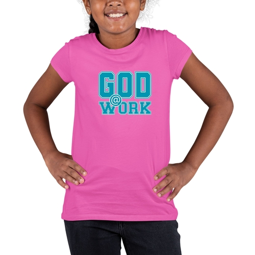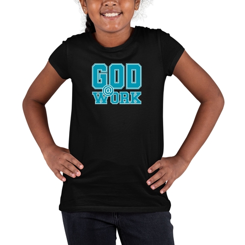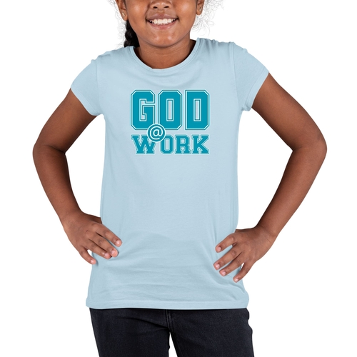 Introducing the Youth Short Sleeve Graphic T-shirt featuring the inspiring message 'God @ Work' in a vibrant blue, green, and white print. This T-shirt is designed specifically for girls who value both comfort and style. Made from high-quality preshrunk cotton, this shirt ensures that it retains its softness and size even after multiple washes, making it a reliable choice for everyday wear.