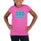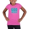 This T-shirt features a tubular body design, which not only contributes to its stylish appearance but also allows for ease of movement. The neck and shoulder taping provides additional stability and stretch resistance, making it perfect for girls who are always on the go. The eye-catching blue, green, and white print of 'God @ Work' serves as a positive reminder and makes a bold statement.