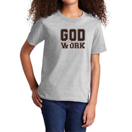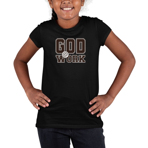 Introducing the Youth Short Sleeve Graphic T-shirt featuring the inspiring God @ Work print in a stylish brown and white color scheme. This T-shirt is designed for young girls who value both comfort and fashion. Made from high-quality preshrunk cotton, this shirt ensures that it retains its softness and size even after multiple washes, making it a reliable choice for everyday wear.