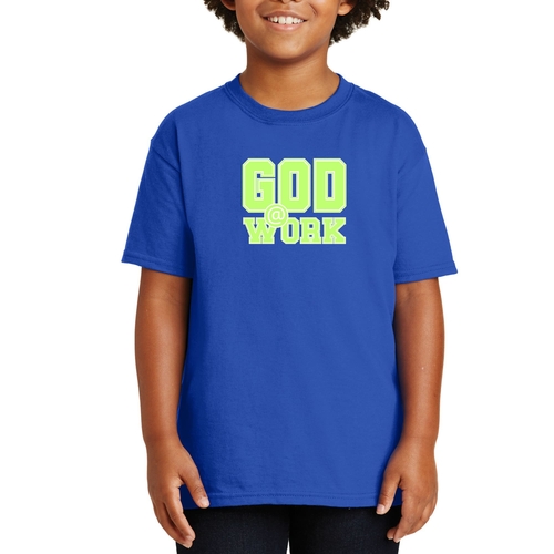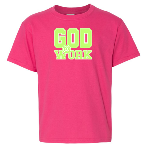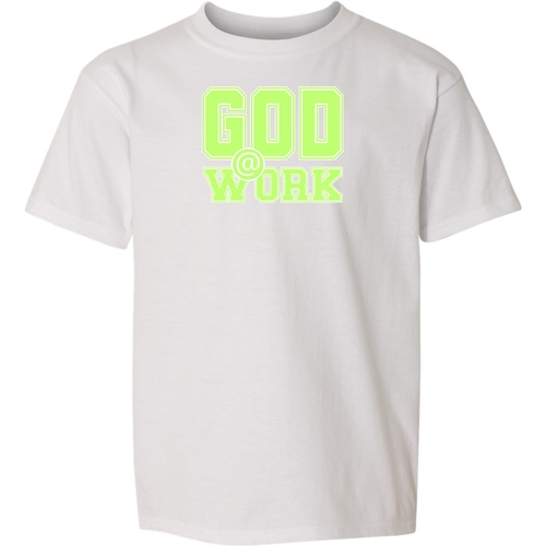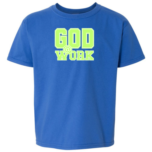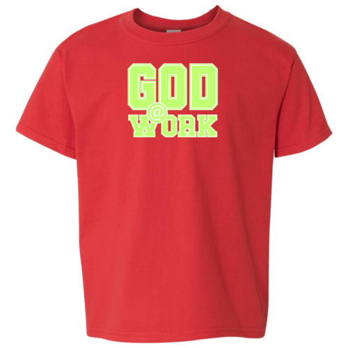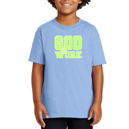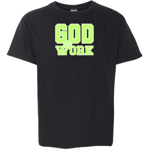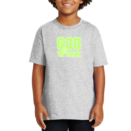 In summary, our Youth Short Sleeve Graphic T-shirt with the 'God @ Work' print is a must-have for any young individual looking to express their faith and style. With its comfortable fit, durable material, and eye-catching design, this t-shirt is sure to become a staple in your child's wardrobe.