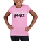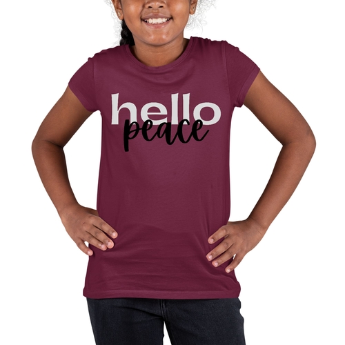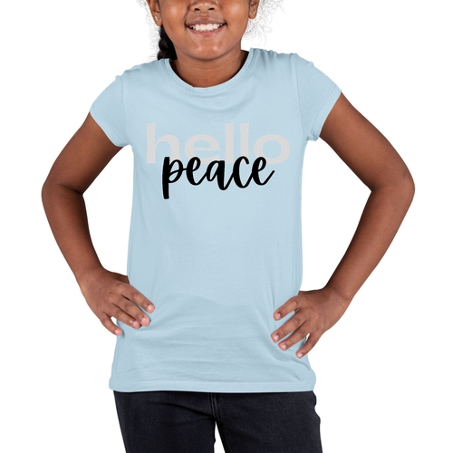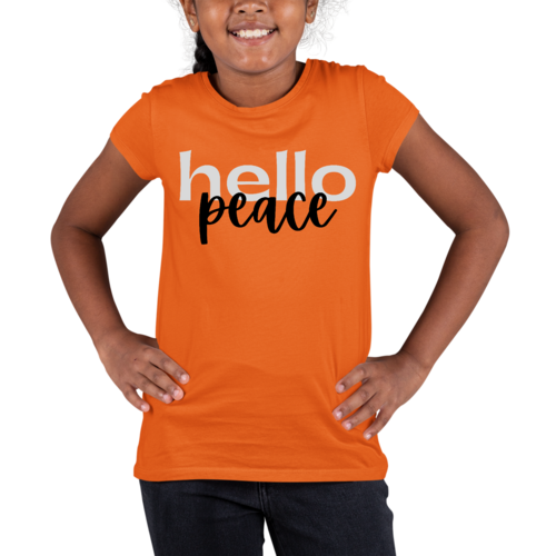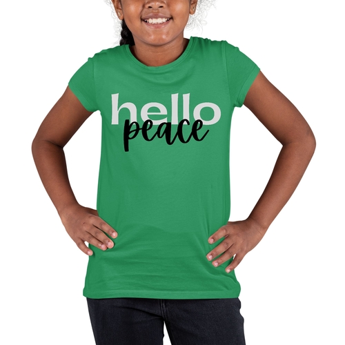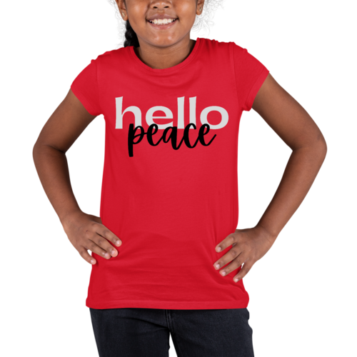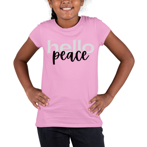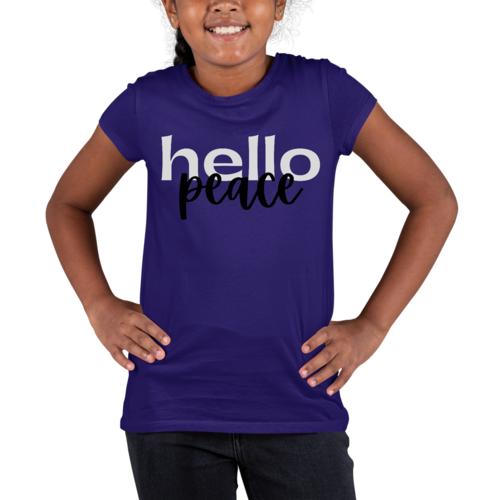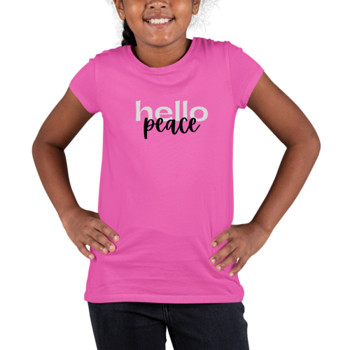This T-shirt showcases a motivational 'Hello Peace' graphic that encourages positivity and peaceful aspirations. The design is printed in the USA, ensuring high-quality printing that stands out. The tubular body construction and neck and shoulder taping provide stability and stretch resistance, making this T-shirt a reliable choice for active young girls.