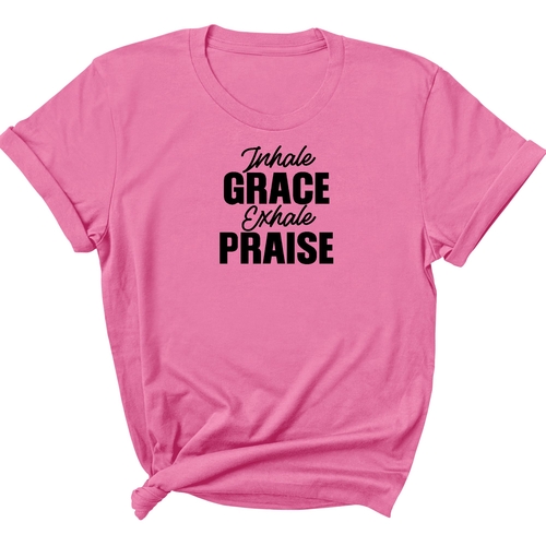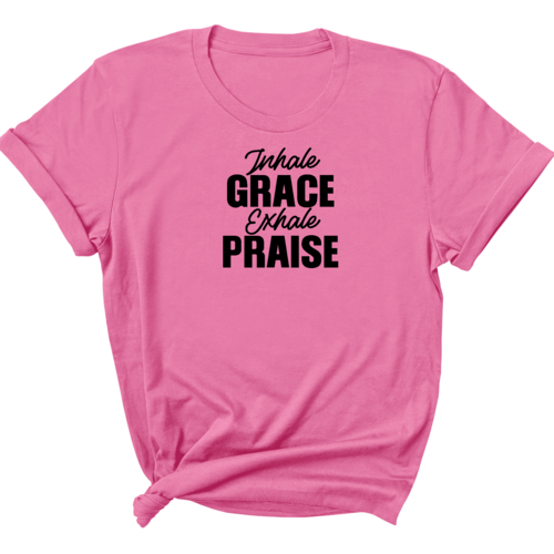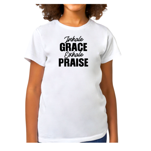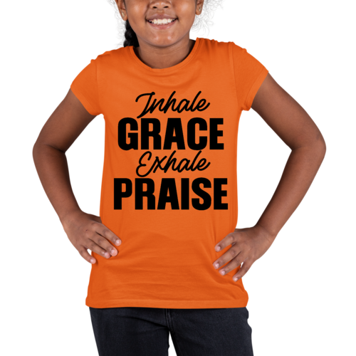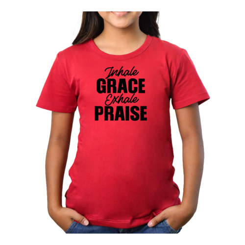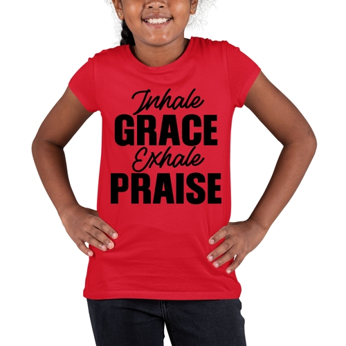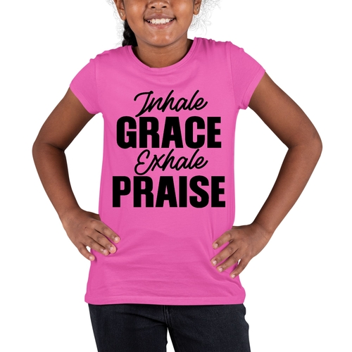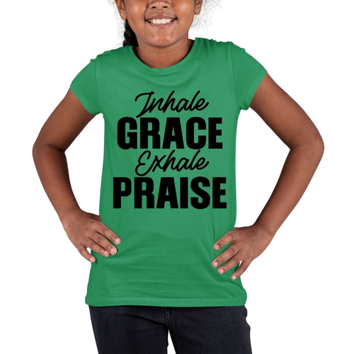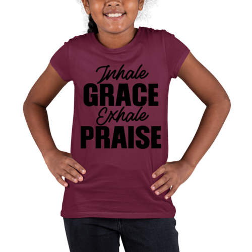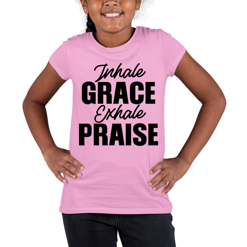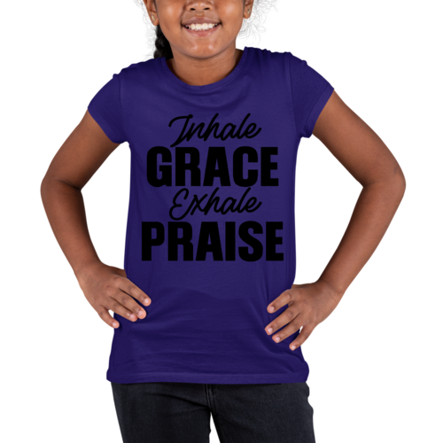 Introducing our Youth Short Sleeve Graphic T-shirt, a perfect blend of comfort and inspiration. Featuring the uplifting phrase 'Inhale Grace Exhale Praise', this T-shirt is designed for young girls who want to express their faith in style. Made from soft, preshrunk cotton, this shirt ensures that it retains its softness and size even after multiple washes, making it a practical choice for everyday wear.