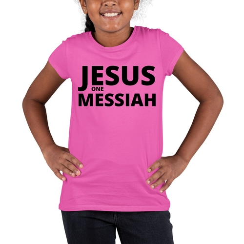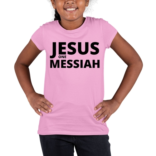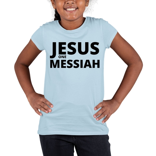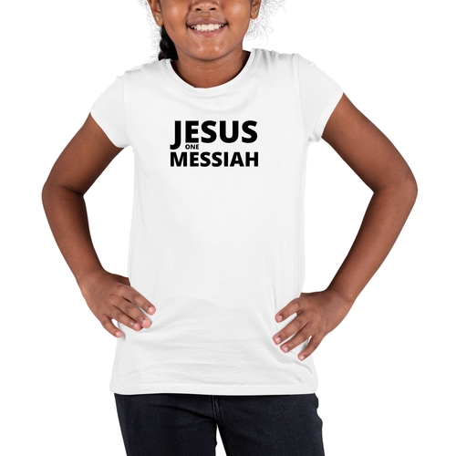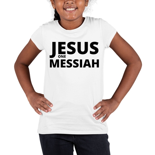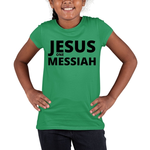 Introducing the Youth Short Sleeve Graphic T-shirt featuring the inspiring message 'Jesus one Messiah'. This stylish and comfortable T-shirt is designed for both men and women, making it a versatile addition to any wardrobe. Crafted from high-quality preshrunk cotton, this T-shirt ensures that it retains its softness and size even after multiple washes, providing you with lasting comfort and durability.